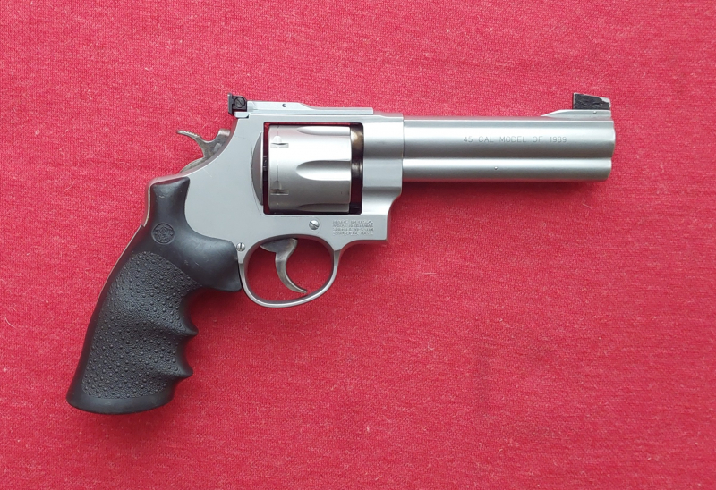 Ein Revolver von Hersteller "Smith & Wesson" - Mod. 625-6, Schriftzug am Lauf: " 45 Cal Model of 1989 " / Kal.: .45 Auto / Stainless-Steel-Ausführung / sehr guter Zustand, nur wenig oberflächige Spuren / die Züge im Lauf sind scharf und blank / Lauflänge ist 126mm (5") / Gummigriffe