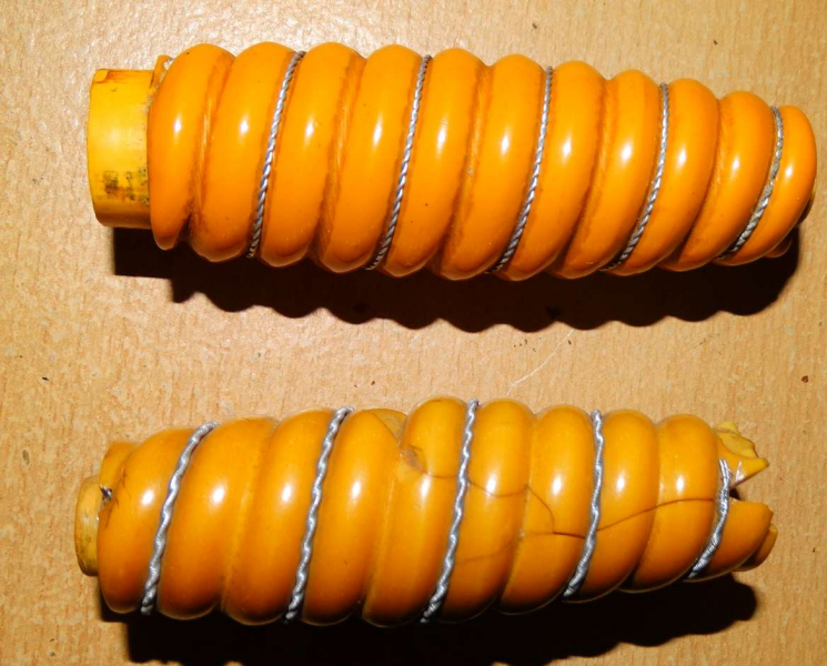 2 Original Griffe für den Offiziers Luftwaffendolch. Einer mit Ausbrüchen, siehe Foto (aber noch als Ersatzteil brauchbar, der andere in gutem Zustand, allerdings fehlt eine Wicklung. Beide Griffe aus Trollon.