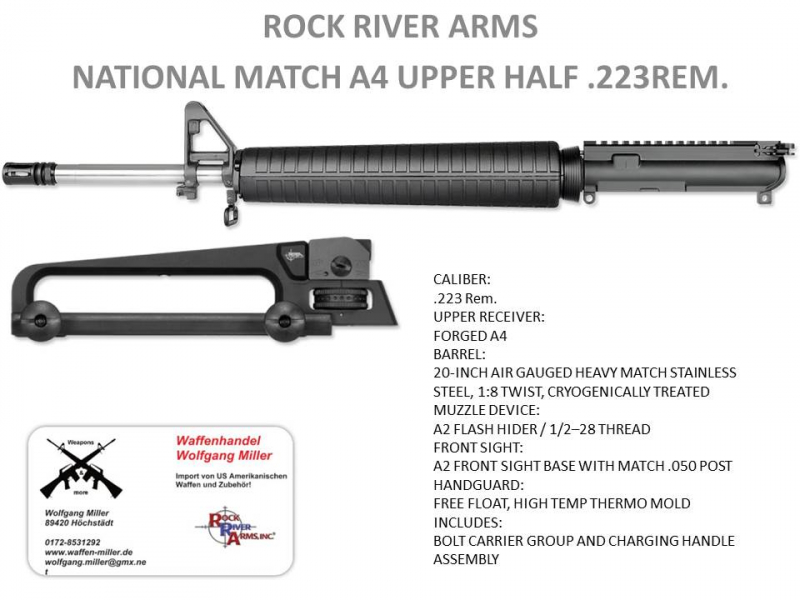 Biete einen Upper (Wechselsystem) des US Top Herstellers Rock River Arms. Modell National Match A4. Die Waffe vefügt über einen freischwingenden Stainless Lauf! Bei diesen Modellen nur von RRA zu bekommen! CALIBER:.223Rem. UPPER RECEIVER:FORGED A4 BARREL:20-INCH AIR GAUGED HEAVY MATCH STAINLESS STEEL, 1:8 TWIST, CRYOGENICALLY TREATED MUZZLE DEVICE:A2 FLASH HIDER / 1/2–28 THREAD FRONT SIGHT:A2 FRONT SIGHT BASE WITH MATCH .050 POST HANDGUARD:FREE FLOAT, HIGH TEMP THERMO MOLD INCLUDES:BOLT CARRIER GROUP AND CHARGING HANDLE ASSEMBLY www.waffen-miller.de Wechselsysteme sind ohne Voreintrag zu erwerben, es muss lediglich die Grundwaffe eingetragen sein. Der Upper ist mit allen AR15 Systemen kombinierbar auch für HK MR223 A3 Bitte nehmen Sie Kontakt zu mir auf.