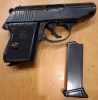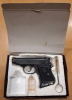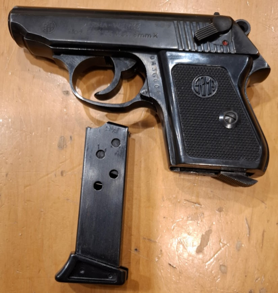 Zum Verkauf steht eine ERMA-WERKE EGP 55 im Kaliber 8 mm Knall mit der PTB-Zulassung 399. Beschriftungen: „ERMA-WERKE Mod. EGP 55 Kal. 8 mm K“ / „Made in W. Germany“. Seriennummer 043660 – entspricht dem Aufkleber auf der Originalbox. Zustand siehe Bilder: Brünierung mit Kanten-/Lagerspuren, keine Bastelspuren sichtbar. Funktion i. O., Sicherung links am Schlitten, einreihiges Magazin. Lieferumfang: Pistole, 1 Magazin, Original-Pappbox (Styroporeinsatz), Reinigungsbürste – siehe Fotos.