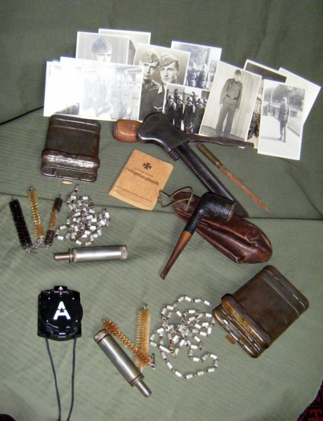 2 RG 34 Komplett mit Inhalt einmal Apel (1938) und HAWIG, Marschkompass schöner Zustand ( leider hängt die Nadel ) ideal für die Kartentasche, Tabaksbeutel mit Pfeife, katholisches Feldgesangbuch, Werkzeug Waffenmeister Großer verstellbarer Schlüssel mit Mauseremblem Schlitzschraubendreher und Schlüsselpfeile mit Patronenhülsen Griff einige Originalfotos in Postkartengröße.
