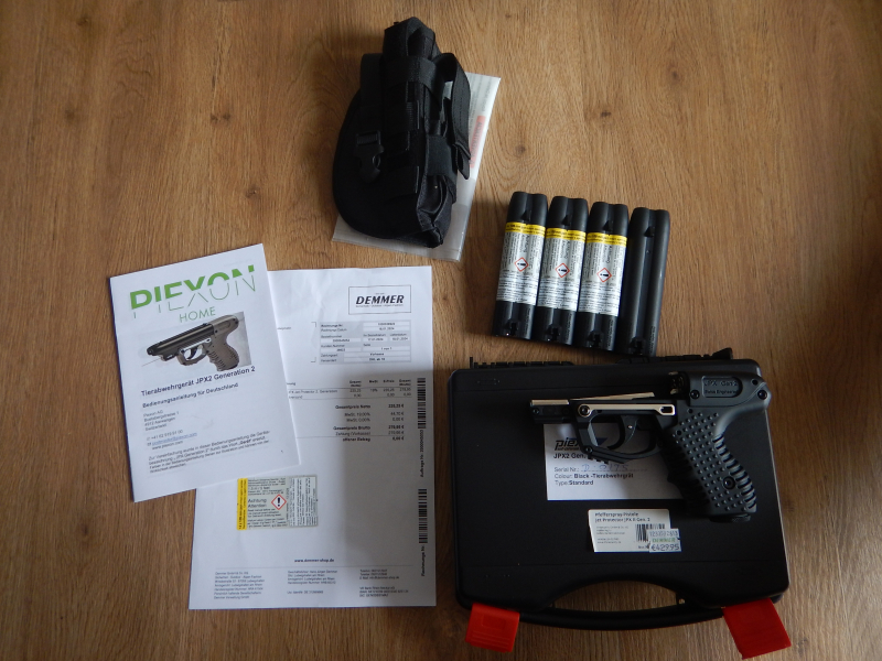 Tierabwehrgerät Piexon, JPX2 Generation 2, unbenutzt, 4 Kartuschen (3x haltbar bis 12/2029, 1x haltbar bis 12/2028, inkl Holster mit Kartuschenhalter, Rechnung, Koffer und allen Unterlagen