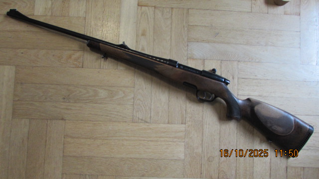 Deutsche Backe, dt. Stecher, Kimme und Korn, 5-Schuss Makralon Magazin, Schiebesicherung, Riemenbügelösen, Edelholzabschluss am Vorderschaft und am Pistolengriff, ventilierte Neopreneschaftkappe, gültiger Beschuss ist vorhanden.