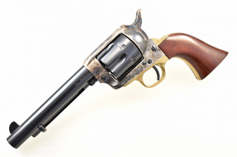 Brünierter Single - Action Ganzstahl Revolver im " Colt 1873 SAA Stil " aus italienischer Produktion der Aldo Uberti S.r.l. Modell Cattleman. Spiegelblanker Lauf. Beschuß 2005. Rahmen und Hammer und buntgehärtet. Griffrücken und Abzugsbügel in Messing - Ausführung. Glatte Nußbaum - Holzgriffschalen. Leichte Gebrauchsspuren sind vorhanden. Details siehe Bilder.
