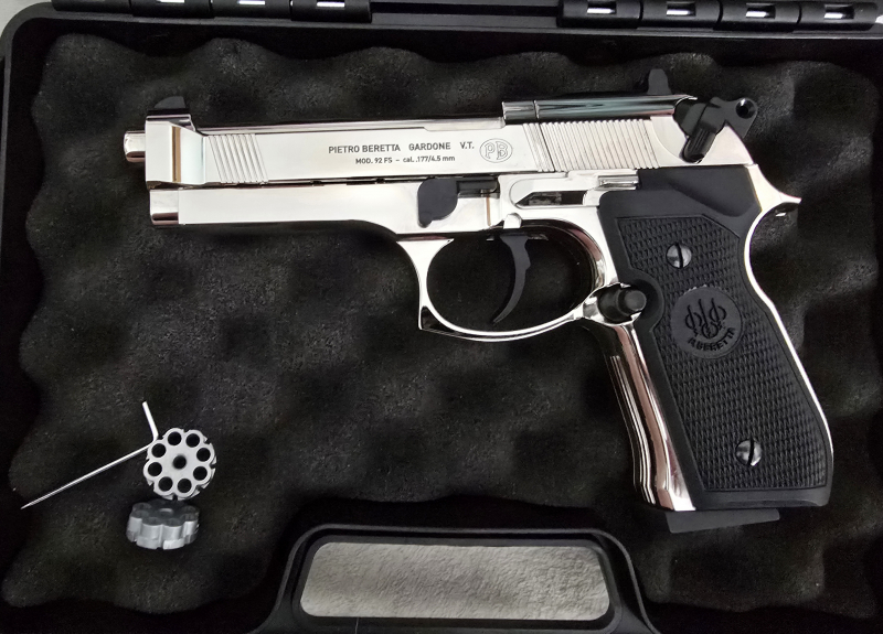 Hallo, biete hier eine Beretta 92 FS in chrom, CO2. 4,5mm Diabolo. Die waffe ist in einem absoluten Traum zustand, keinerlei gebrauchspuren. Wurde auch nicht geschossen, ist wie neu. Mit dabei ein koffer und 2 laderinge.