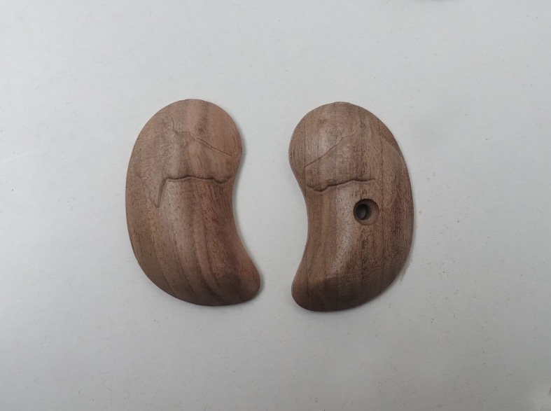 Die Griffschalen haben Pferdekopf-Gravur bzw. -Umriss und sind unversiegelt auf der Oberfläche, damit der Verbraucher die Griffschalen nach seinem eigenen Wunsch färben (beizen), ölen oder wachsen kann.