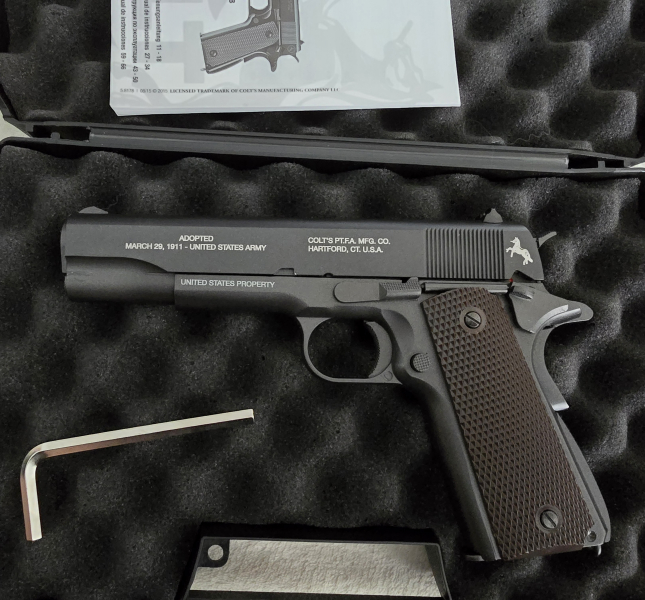 Hallo, biete hier eine Colt 1911 A1 Commorative, CO2. 4,5mm BB, schwarz, diese waffe ist auf 1911 stück limitiert, diese hat die nummer 1287 sammlerwaffe. Die waffe ist in einem neuwertigen zustand, minimale gebrauchspuren. Wurde nicht geschossen. Mit dabei ein koffer, anleitung und sechskantschlüssel. Waffe hat Blowback und ist aus Metall. Waffe wurde sehr gepflegt.