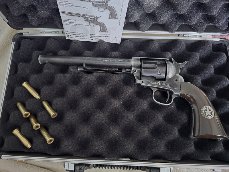 Hallo, biete hier einen Colt SAA U.S. Marshall edition 7", CO2. 4,5mm BB, antik schwarz, seltene Sammlerwaffe, Die waffe ist in einem neuwertigen zustand, keinerlei gebrauchspuren. Wurde nicht geschossen. Mit dabei ein koffer, anleitung und 6 ladehülsen. Waffe hat kein Blowback und ist aus Metall. Waffe wurde sehr gepflegt.