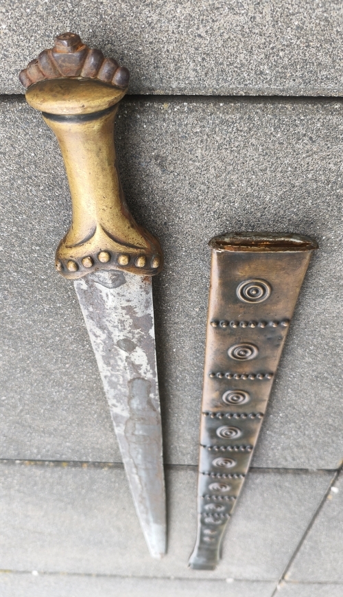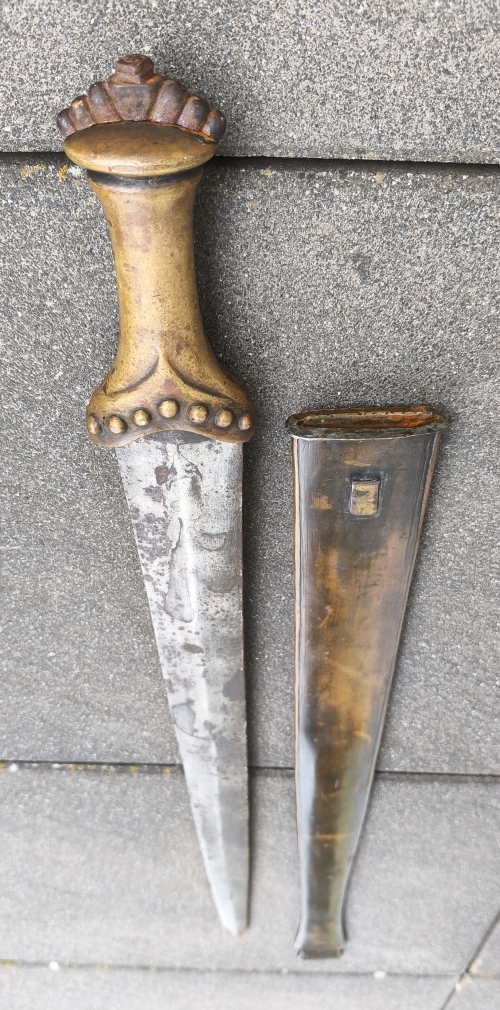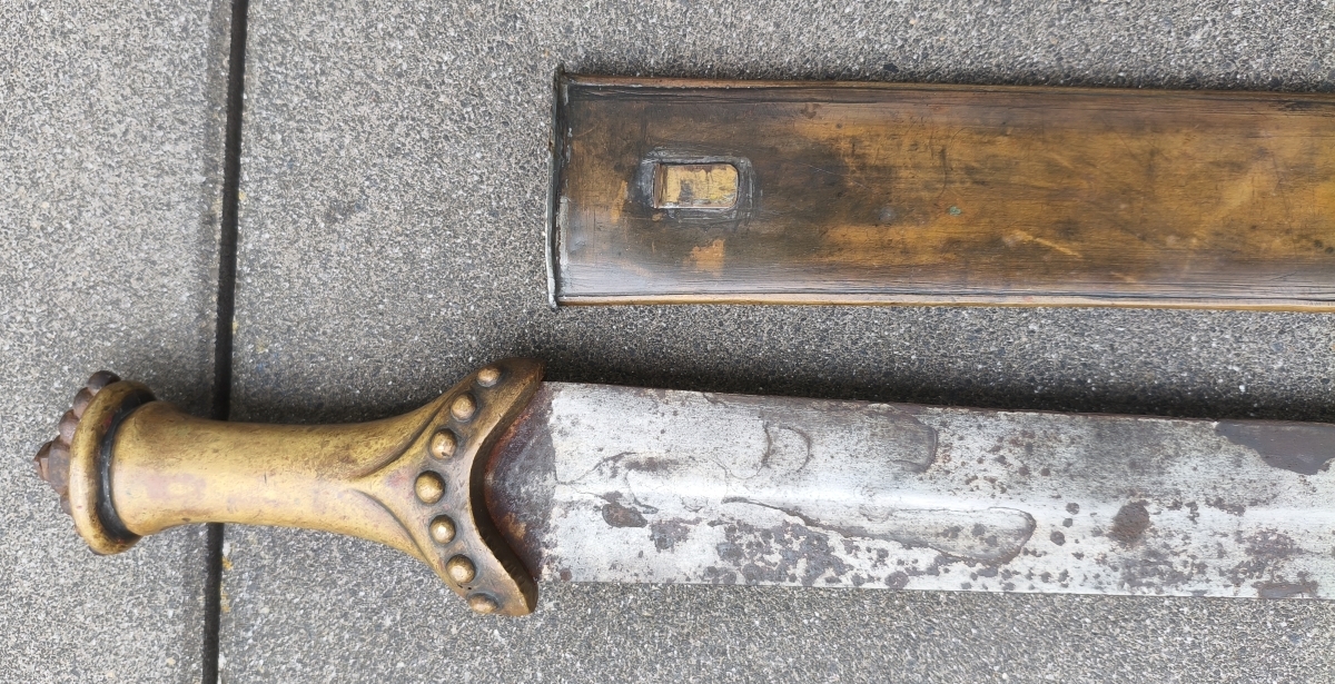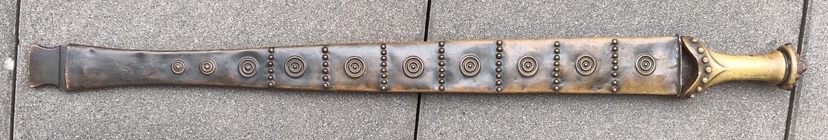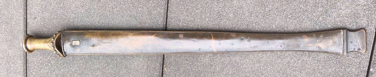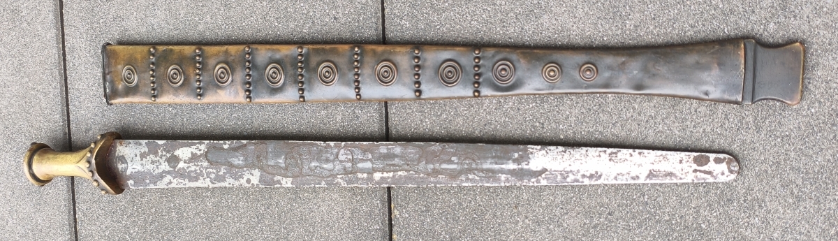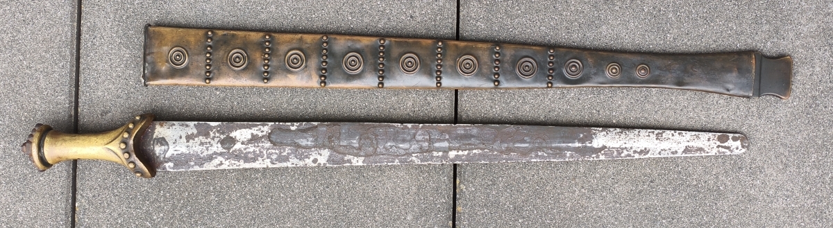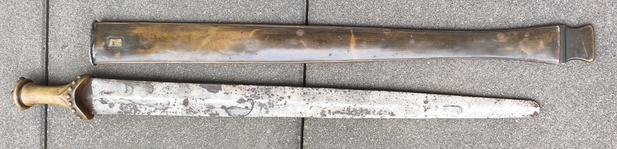 Zweischneidige mittig gegratete Klinge, beidseitige Schneide im Verlauf stumpf. Verziertes Messinggefäß mit eisernem Abschluss. Auslauf des Tragehakens fehlt. Gesamtlänge 79,3cm mit Scheide.