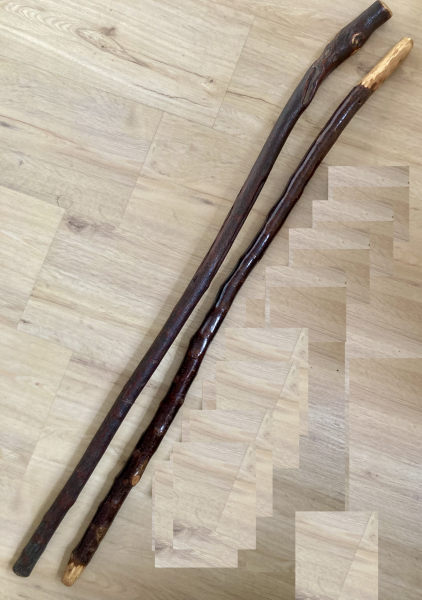 Ich biete hier zwei handgefertigte irische Shillelaghs an, die berühmten Spazier- und Kampfstock aus Irland. Diese Stöcke aus Blackthorn (Schwarzdorn, Schlehe) wurden in Irland zur Selbstverteidigung und in den berühmt-berüchtigten Faction-Fights benutzt. Handgefertigt in Irland vom Traditions-Stockmacher Joe Taylor. Es handelt sich hierbei um zwei rustikale Wander- und Kampfstäbe, einer mit Handschlaufe aus Leder und Schutzfuß (Gummikappe). Der zweite ist sozusagen eine Gratis-Zugabe, da dieser als Restposten unfertig ist (braucht nur noch eine Stockspitze, Endkappe oder Bergstockspitze). Beide ca. 98 cm lang und zwischen 400 und 500 g schwer. NP zusammen 90 Euro. Da dies ein privater Verkauf ist, gewähre ich keine Garantie und kein Rückgaberecht (siehe EU-Recht). BEI SOFORT-KAUF erlasse ich die Versandkosten (innerhalb Deutschlands).