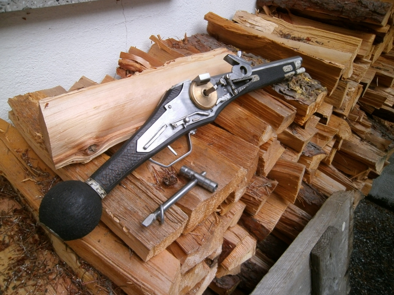 Biete euch einen nachbau eines Radschlosspuffer an,der so um 16.Jah in Sachsen getragen wurde.Schaft aus Buche mit einlagen genoppt und gebeizt.Lauf glatt in kal.14mm mit beschuss.Schloss mit Radabdeckung Sicherung und gefederten Pfannendeckel.Schlüssel und Beschussbescheinigung mit bei.Keine Rücknahmee da Privat.Gruß mimono