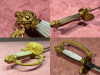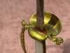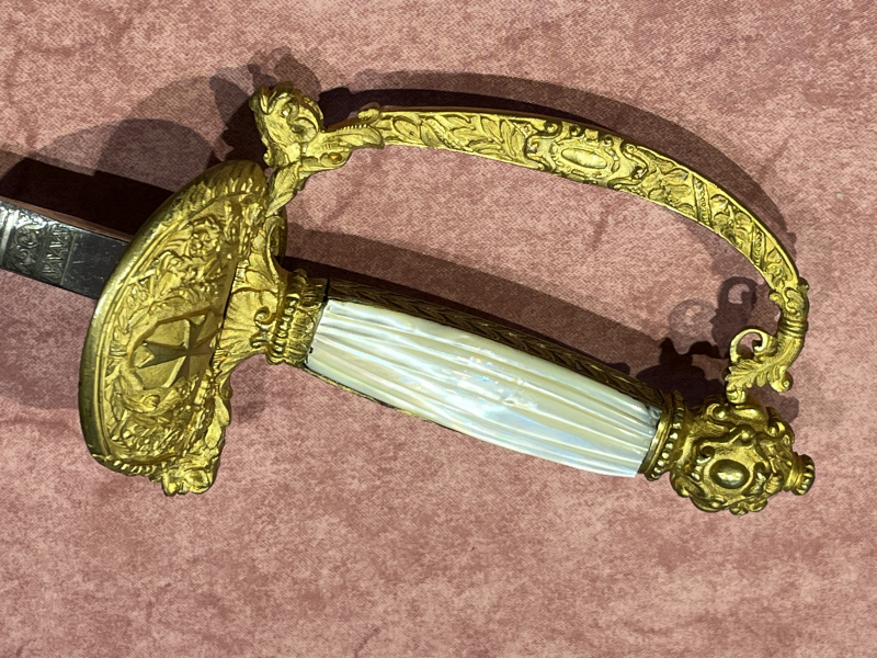 Der Griffbügel nicht 100% fest, die Feuervergoldung noch sehr gut erhalten. Florale Muster am Bügel unterbrochen von einem gemusterten Band, am Parierlappen ein Kreuz als Anhänger an einem Band.