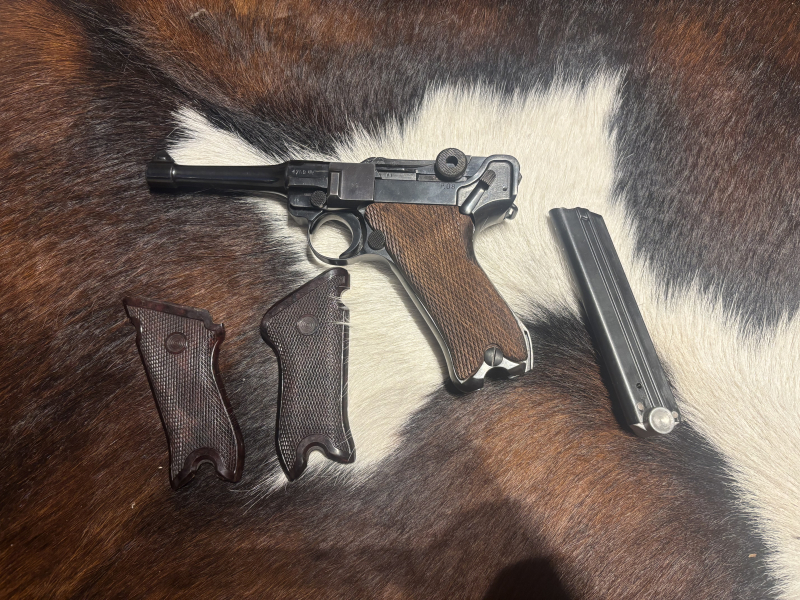 Hallo und schönen guten Tag. Sie bieten hier auf eine P08 der Firma Mauser im Kaliber 9x19. Die Waffe besitzt einen gültigen Beschuss und befindet sich in einem Top Zustand!!! Es hat mir immer viel Freude bereitet wenn ich die Waffe, ein mal im Jahr, auf dem Schießstand führen durfte. Schnell wurde sie zum Gesprächsthema Nummer Eins. Sie ist, soweit ich das beurteilen kann, Nummerngleich außer dem Magazin. Es gibt auch noch die Originalen Bakalit Griffschalen und ein Holster mit Koppel hinzu. Das Holster ist natürlich eine Repro aber die Koppel schein alt zu sein, vermutlich russisch. Gerne stehe ich ihnen bei Fragen zur Verfügung. Viel Spaß beim bieten