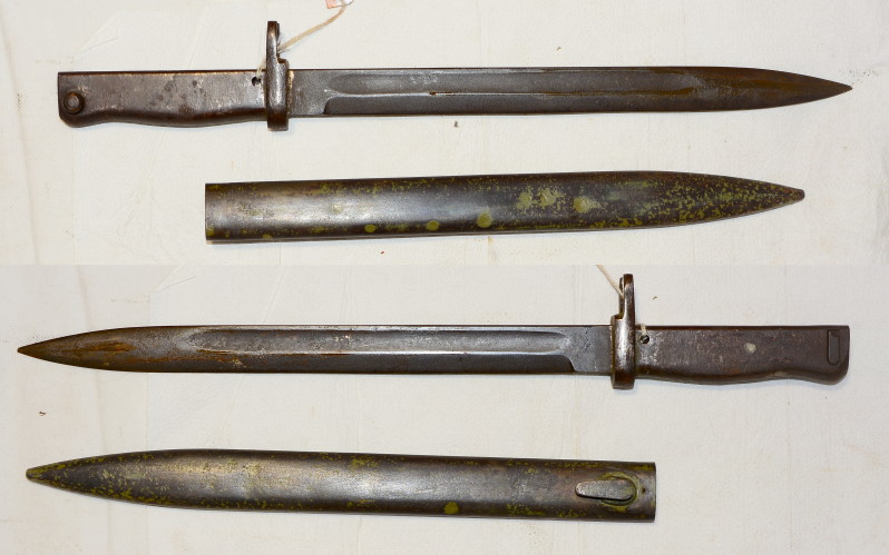 Deutsches Ersatzbajonett 84/98, Ganzstahl, keine Herstellerangabe oder andere Stempel, Klingenlänge 31,2 cm, Rückseite der Scheide mit 2 kleinen Dellen, Scheide mit Resten feldgrauer Farbe, insgesamt guter Zustand