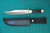 Das hier angebotene Bowie ist mit 13 3/4 Zoll Gesamtlänge ein richtiges Bowie. Die Klingenlänge beträgt 222 mm, also 8 3/4 Zoll. Sie hat eine Stärke von satten 6 mm. Der Klingenspiegel und die falsche Schneide vorne ist hochglanzpoliert. Der Anschliff hat eine schöne seidenmatte Oberfläche. Die Klinge hat keinerlei Kratzer und sieht top aus, auch die Beschriftungen.