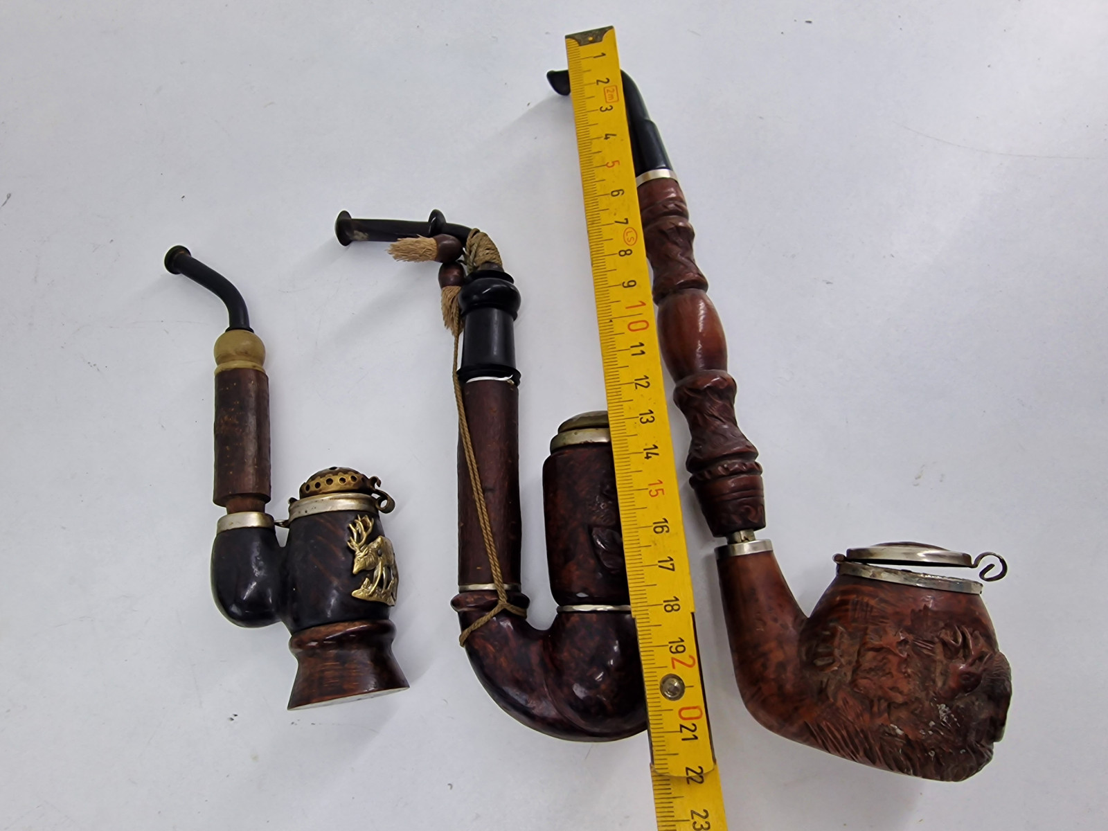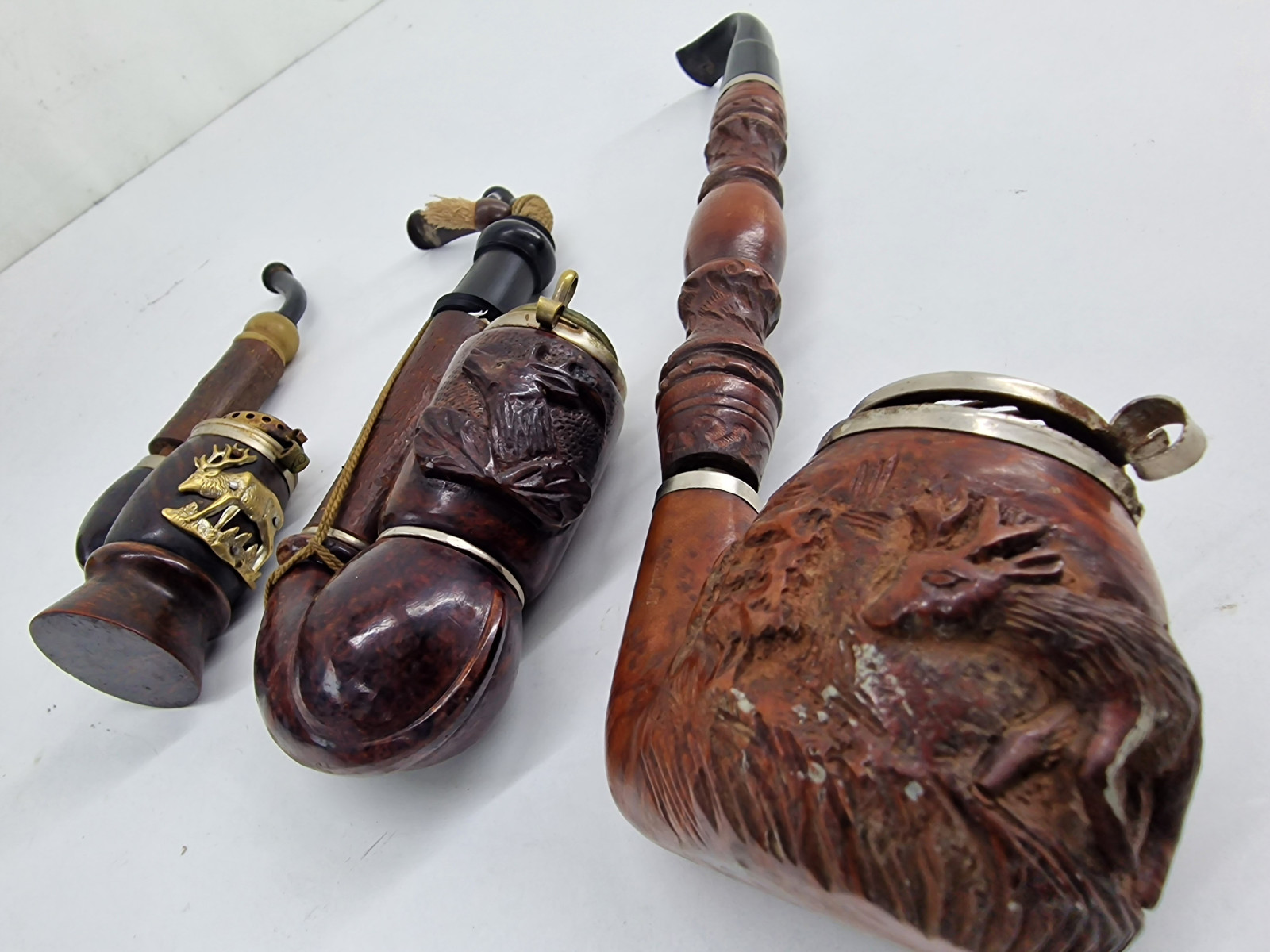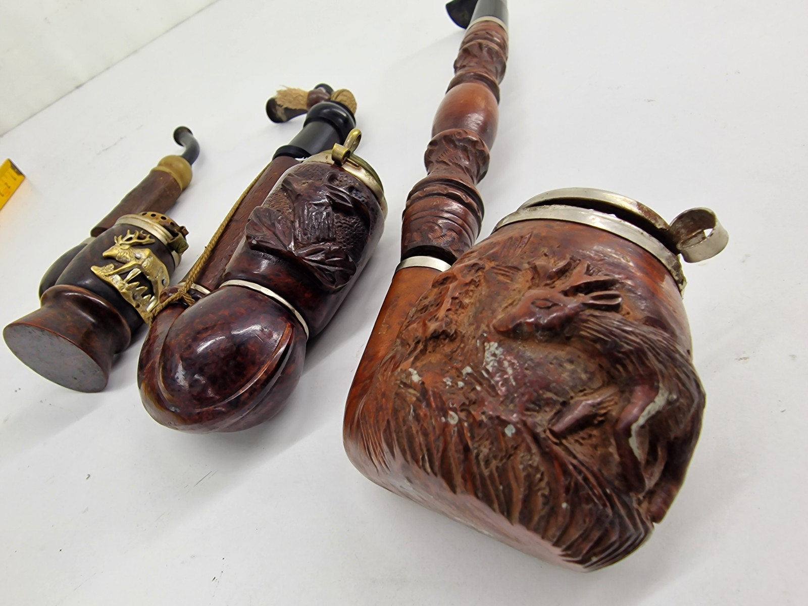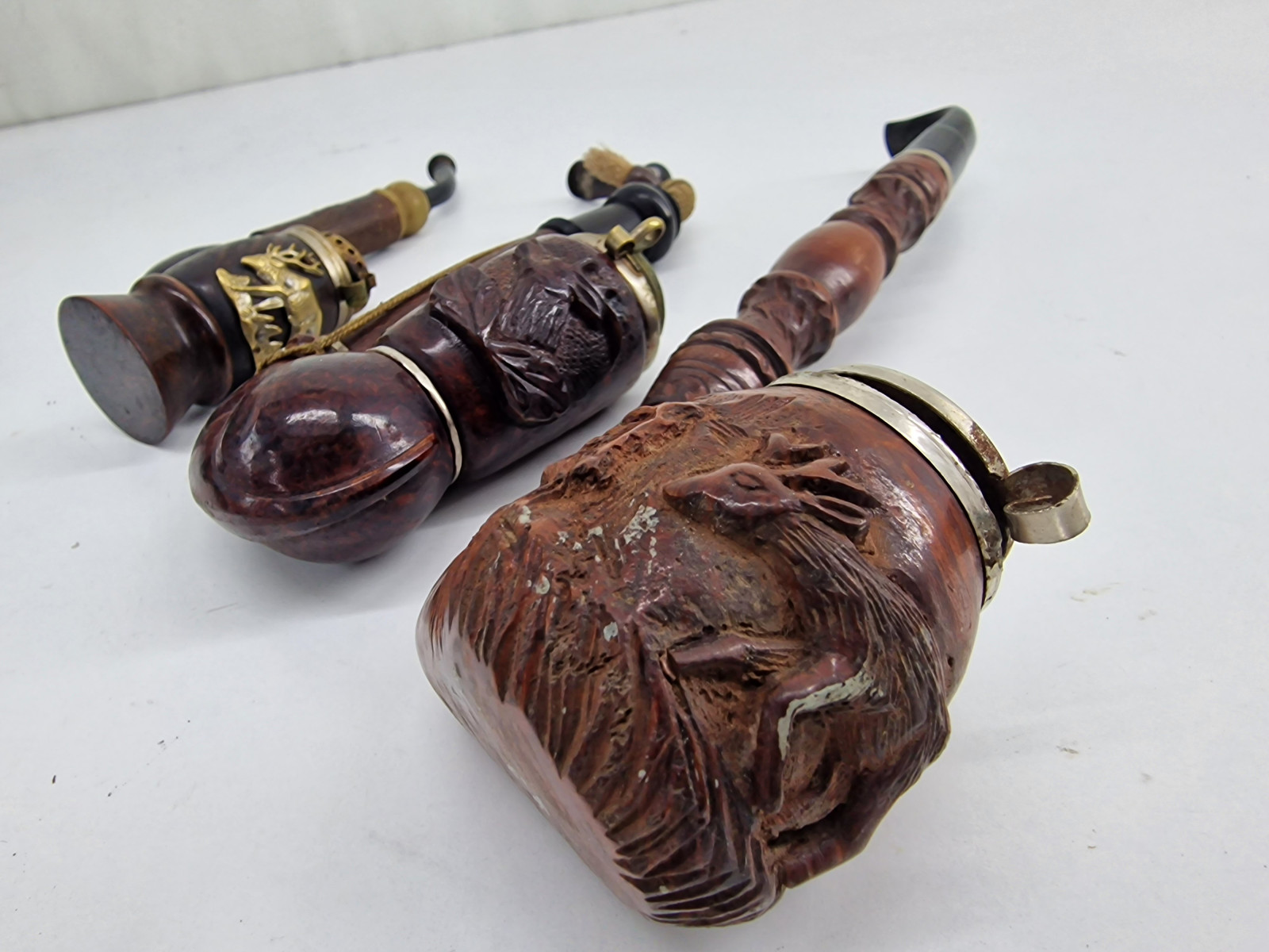 1 Posten = 3 alte Pfeifen mit jagdlichen Motiven / Schnitzereien