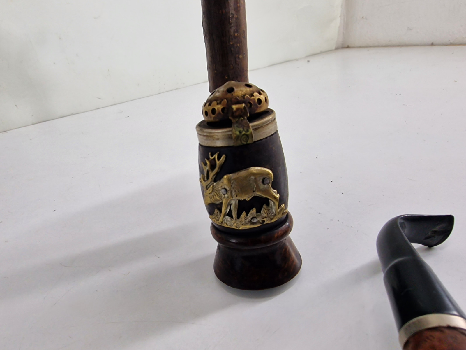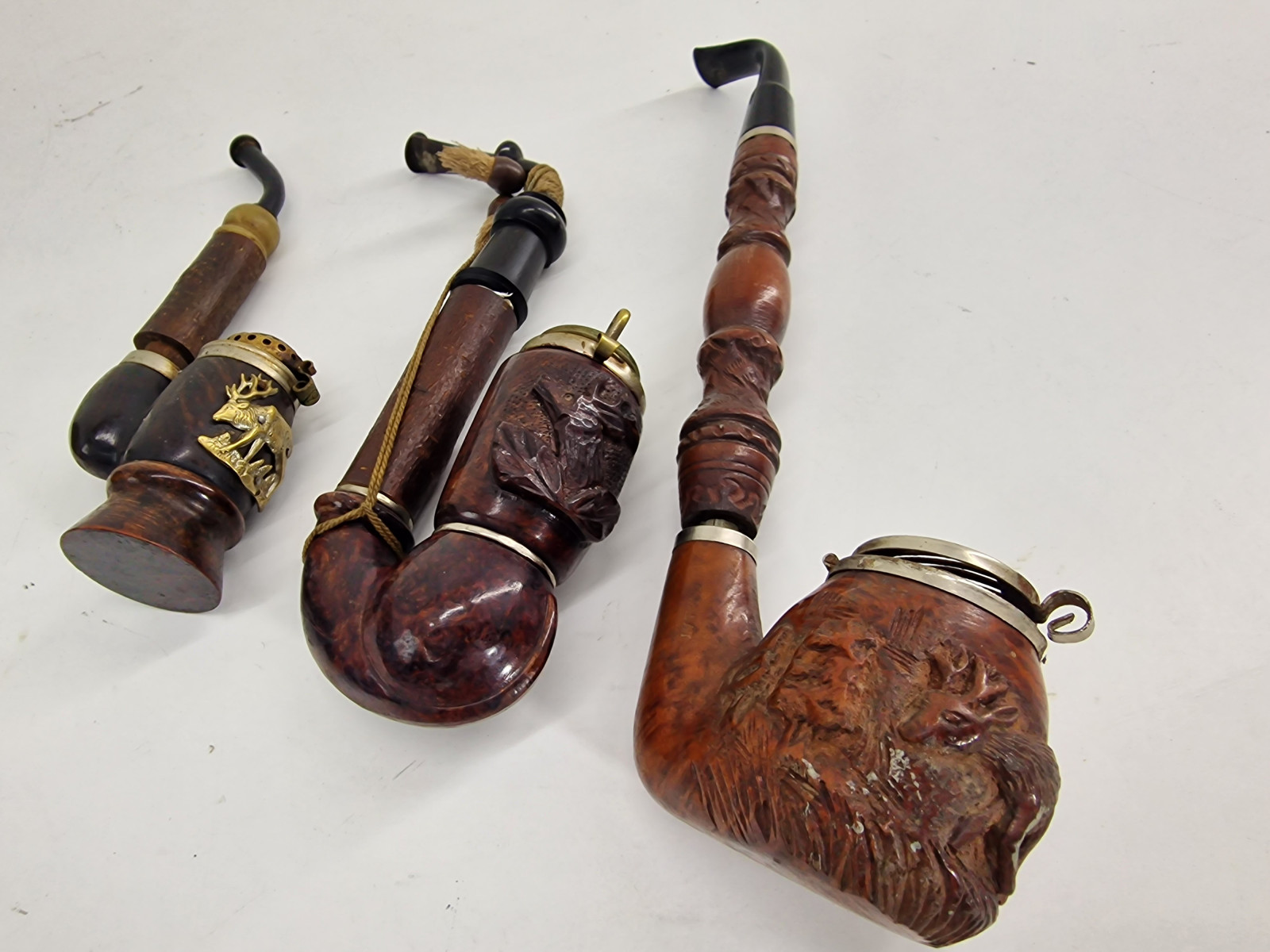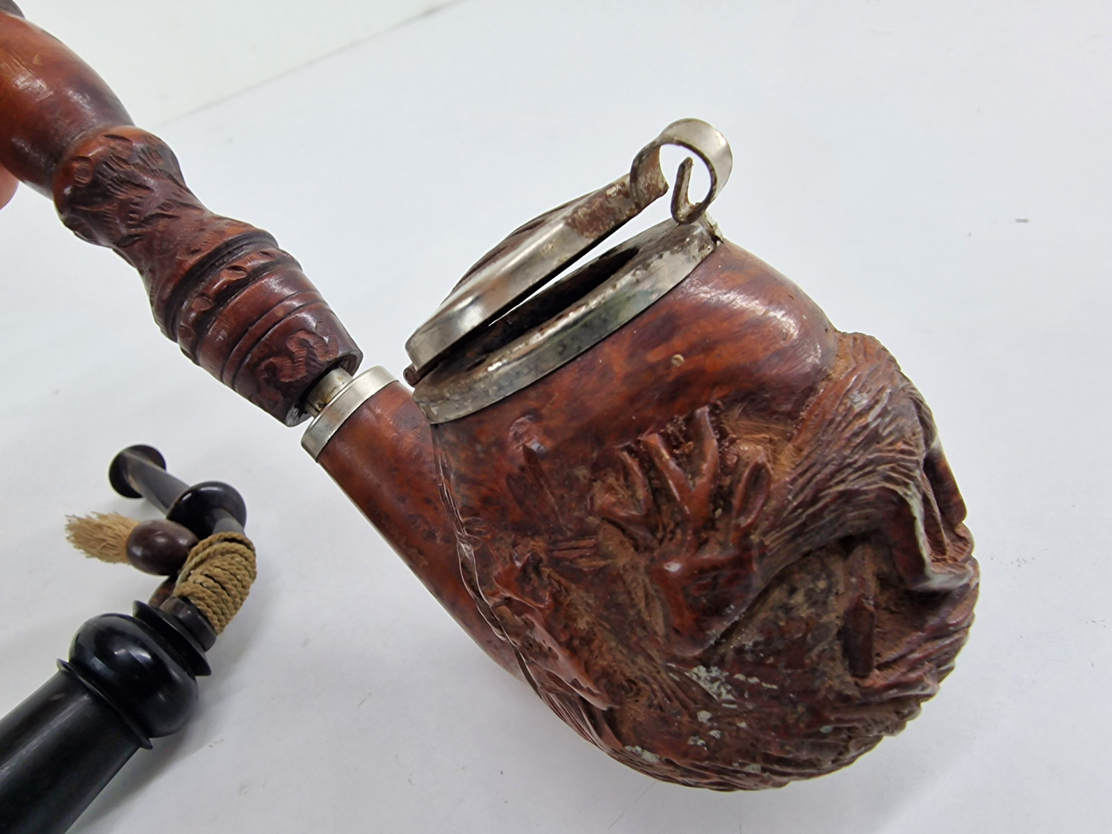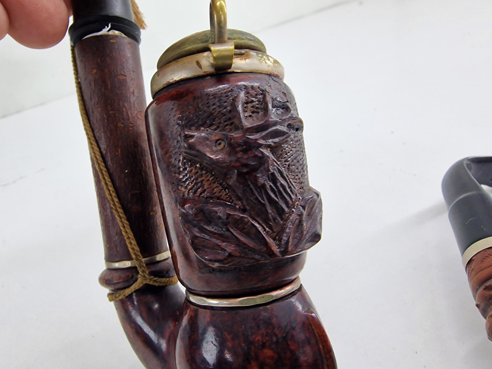 1 Posten = 3 alte Pfeifen mit jagdlichen Motiven / Schnitzereien