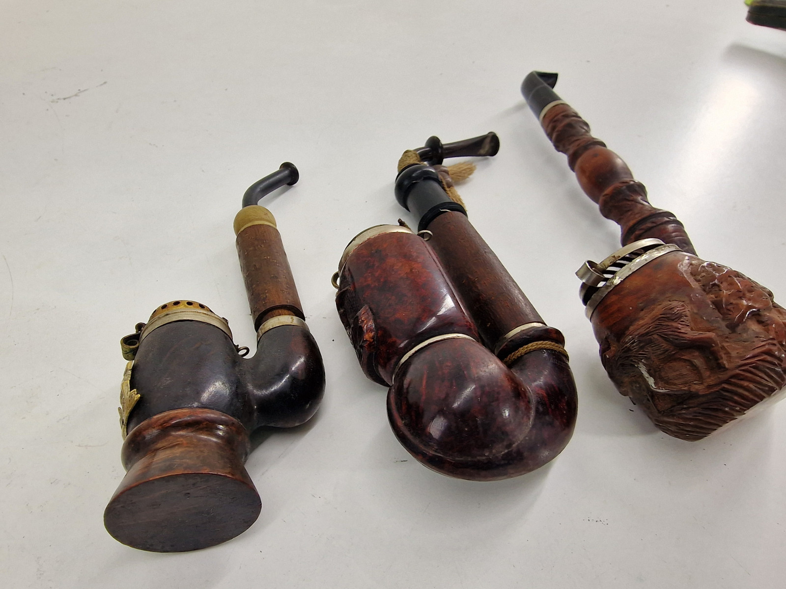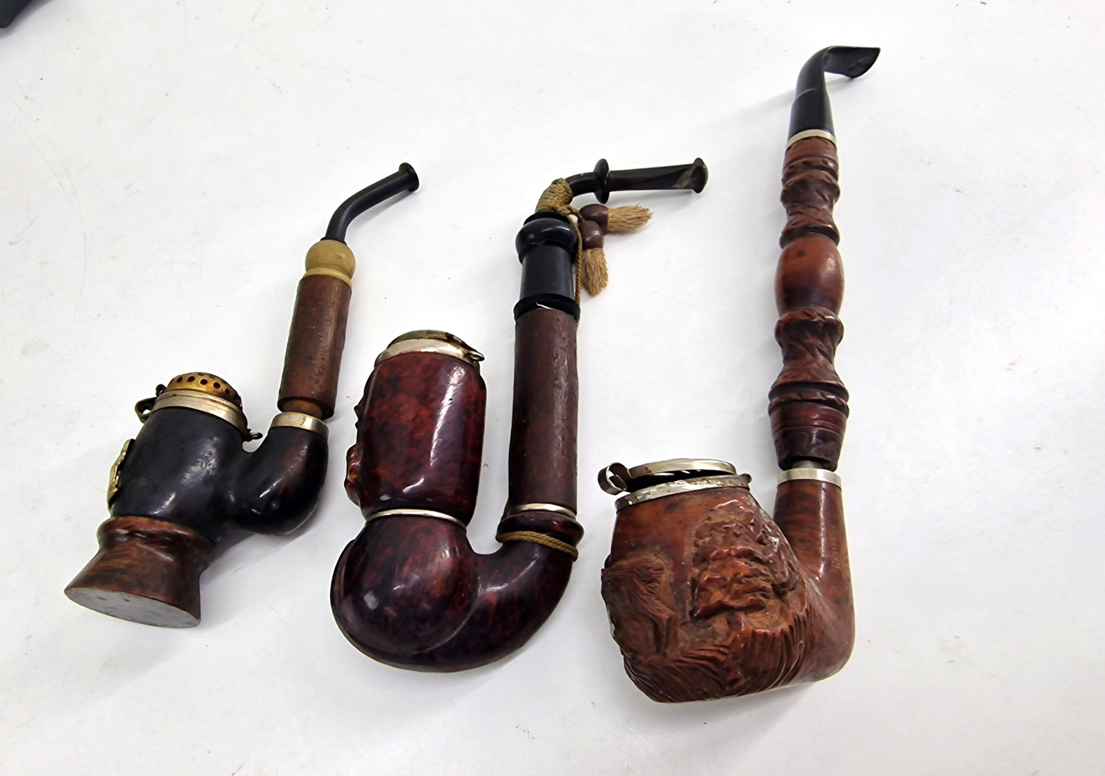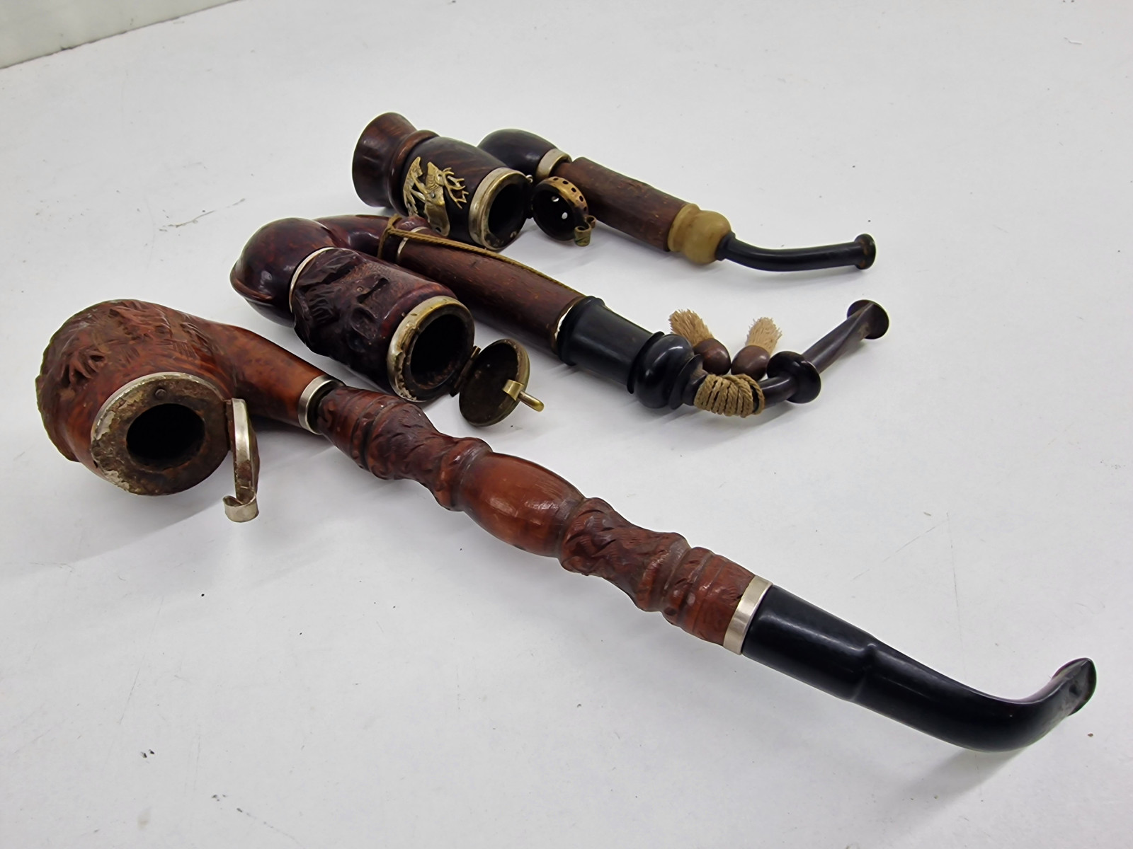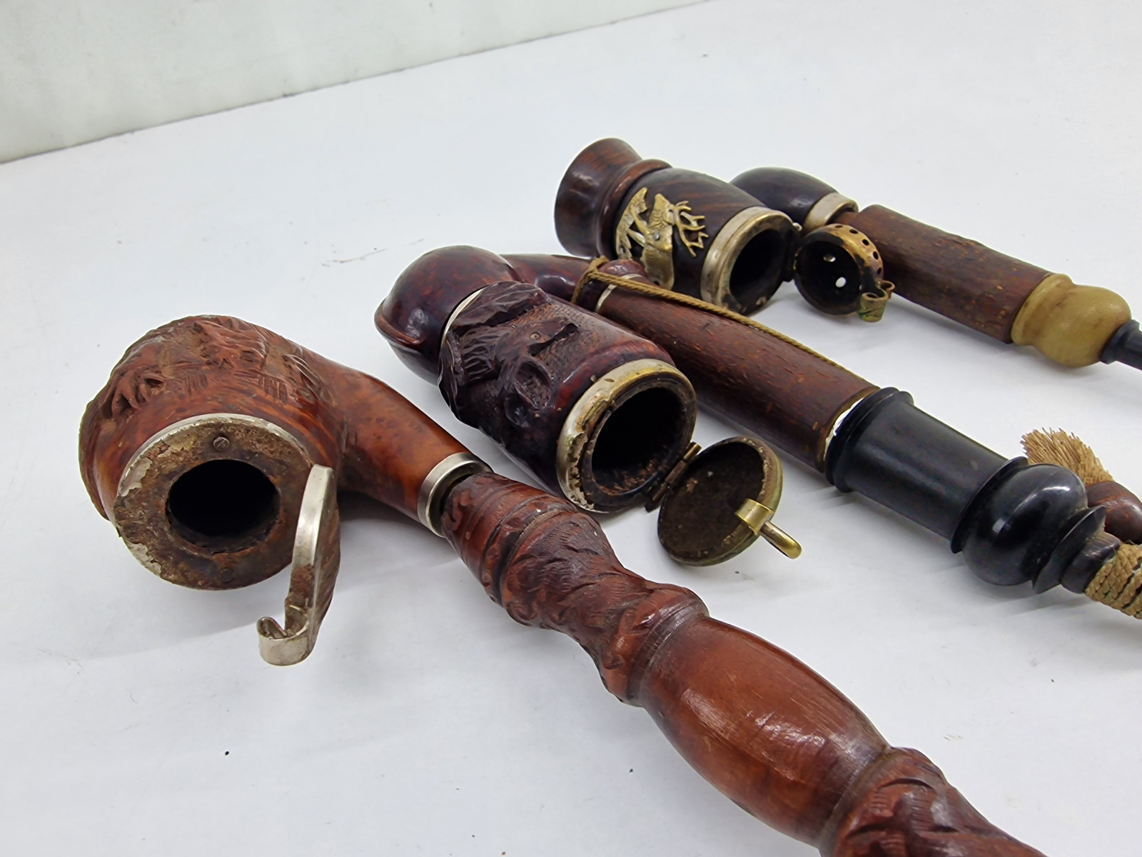 1 Posten = 3 alte Pfeifen mit jagdlichen Motiven / Schnitzereien