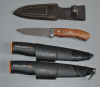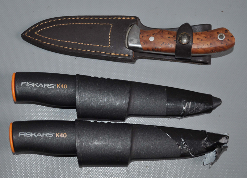 Zustand: Messer nur einige Male gebraucht, mit Gebrauchsspuren - siehe Fotos, beide Fiskarsscheiden getaped (eins vorne mit Fehlstück, das andere mit Riss)