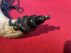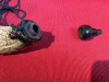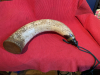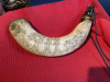 Aus Nachlass großes altes Pulverhorn mit Tülle aus Büffelhorn reich beschmutzt selten