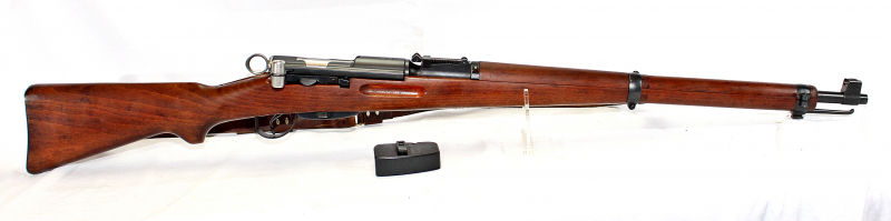 Aus besten Materialien gefertigter, nummerngleicher Repetierer. Geradezugverschluss. Das abnehmbare Kastenmagazin fasst 6 Patronen. Das originale, nummerngleich Magazin liegt ebenfalls bei und wurde auf Einzellader umgebaut. Spiegelblanker Lauf für beste Präzision. Diese Waffe ist in diesem Top Zustand sehr selten geworden. Mit hochwertigen, verstellbaren Sniper Ledertrageriemen.