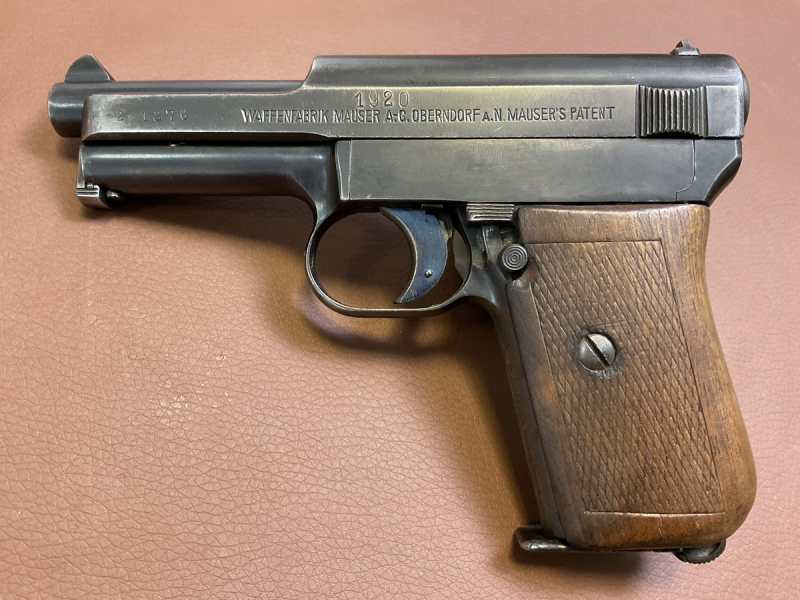 Diese Pistole Mauser Modell 1914 wurde von der Einordnung der Seriennummer zwischen Ende 1920 bis Mitte 1922 (je nach Quelle) neu gefertigt und ging offenbar direkt zur Reichswehr bzw. zu einer Behörde. Dies wurde auch vom Vorbesitzer, einem Mitglied des Arbeitskreises Polizeiwaffen, so erklärt. Ein Dokument aus welchem die Lieferung direkt an die Polizei, wie von ihm genannt, nachgewiesen werden kann, wurde bisher jedoch nicht gefunden. Jedoch ist aufgrund der Seriennummern anderer polizeilich geführter Mauser Modell 1914 eine Zuordnung zu einer direkt an die Polizei ausgegebenen Pistolenlieferung anzunehmen. (naheliegende Seriennummern bspw. im Buch „German Police Markings“ von D. Maus) Die Pistole weist eine nach den Stempelvorschriften des Versailler Vertrags auf der linken Verschlussseite auf. Diese „1920“ Stempelung musste auf allen behördlich geführten Waffen angebracht werden. Diese Stempelung musste bis 01.12.1922 (nach einer Fristverlängerung) erfolgt sein. Die Stempelung wird oft nur mit der Reichswehr in Verbindung gebracht. Dies ist jedoch für die tatsächliche Verwendung der Pistole nicht allein ausschlaggebend. Vor der Schaffung der Reichswehr gab es in der Weimarer Republik eine freiwillige Volkswehr, welche nach dem Reichsgesetz zur „Aufrechterhaltung der öffentlichen Ordnung und Sicherheit“ geschaffen wurde. Zudem waren an vielen Orten noch Einwohner- und Bürgerwehren aktiv. Zur „1920“ Stempelung ist anzumerken, dass diese ab dem 01.08.1920 nach einem Befehl des Reichswehrministeriums an allen Handfeuerwaffen und Ausrüstungsgegenständen angebracht werden musste. Hintergrund war hierbei, dass nach einem Gesetz des Reichstags zur „Entwaffnung der Bevölkerung“ eine Prämie für abgegebene Waffen gezahlt wurde. Diese abgegebenen Waffen sollten nach den Bestimmungen des Versailler Vertrags vernichtet werden, sofern diese nicht bei der Reichswehr oder Behörden zum Einsatz kamen. Dort kam es jedoch vor, dass hier Waffen abgezweigt oder unterschlagen und erneut abgegeben wurden, um die Prämie zu kassieren. Durch die „1920“ Stempelung war dies nicht mehr möglich, da nachzuweisen war, dass die Waffe bereits „im Staatsbesitz“ war. Interessant ist bei dem vorliegenden Sammlungsstück besonders die unkenntlich gemachte, bzw. entfernte (polizeiliche/militärische) Markierung auf der Griffstückvorderseite. Es sind Pistolen aus dem Seriennummernbereich dieser Pistole bekannt, welche bei Landjägereien und Schutzpolizeien vor allem in Kölner, Kasseler und Düsseldorfer Raum eingesetzt waren. Da der Erhaltungszustand der vorliegenden Pistole so gut ist, kann angenommen werden, dass diese in einer Landjägerei (Zweitpistole, Ersatzpistole), im Verwaltungsdienst (Schreibtischschublade) oder ggf. auch in einer Polizeischule genutzt wurde. Dafür, dass die Stempelung am Griffstück entfernt wurde kommen mehrere Möglichkeiten in Betracht: a) Die Pistole wurde bereits vor dem Anbringen der „1920“ Markierung zwischen 1920 und 1922 behördlich/militärisch genutzt, wonach dann aufgrund der Vorgabe alte Kennzeichnungen unkenntlich zu machen waren. Möglicherweise erfolgte, aus welchen Gründen auch immer, keine erneute Markierung. Womöglich wurde die Pistole dann „auf Reserve eingelagert“, wobei dann nicht zu erklären ist, weshalb die auf dem Griffstück vorhandene Kennzeichnung relativ grob entfernt wurde, da die „1920“ Stempelung vorschriftsmäßig und fachmännisch angebracht wurde. b) Womöglich wurde die Stempelung zu Beginn oder während des zweiten Weltkriegs entfernt, um die Herkunft und Zuordnung der Pistole zu tilgen. Dafür würde die grob erfolgte Feilarbeit am Griffstück sprechen. c) Die Stempelung wurde möglicherweise nach Kriegsende entfernt um eine Zuordnung zu verhindern und die Waffe im Privatbesitz behalten und verstecken zu können. d) Die behördliche/militärische Stempelung wurde nach Abgabe der Waffe in Privathände (aus dem behördlichen Dienst) unkenntlich gemacht. Dies ist vermutlich aufgrund der groben Feilarbeit nicht in fachkundigen Händen, also bei der Ausgabe vorgenommen worden, sondern eher später im Privatbesitz. e) So könnte die Stempelung von einem Besitzer im Laufe der Jahre später erst entfernt worden sein. Dies ist jedoch ebenfalls unwahrscheinlich, da Bearbeitungsspuren und deren Alterszustand dagegen sprechen. Es ist möglich, dass auf dem Griffstück zwei Markierungen hintereinander angebracht waren,. Naheliegende Seriennummern mit 261xxx mit Markierungen von der Schutzpolizei Düsseldorf sind bspw. im Buch „German Police Markings“ D. Maus abgebildet
