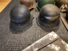 Unter anderem mit dabei WH Helme, ein M18, Luftschutzhelme, Helmliner, Munitionskisten ein Trommelmagazin, ein Panzerfaustkopf und eine Bajonettscheide. Und zwei Verbandspäckchen der WH. Mit dabei ist auch eine US Feldflasche.