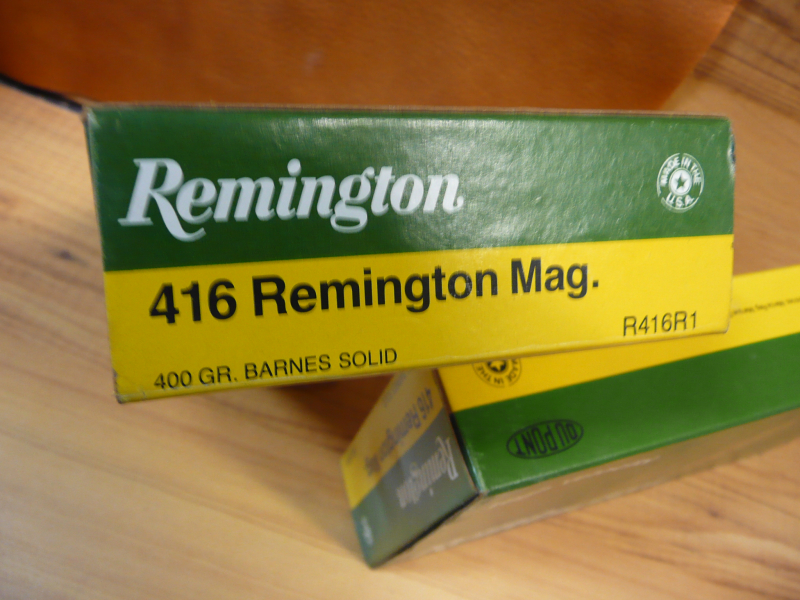 Es werden hier 20 Jagdpatronen für Dickhäuter u. anderes Hochwild im Kaliber .416 Remington Magnum zum Verkauf angeboten. Die Patronen sind mit einem 400 grains Barnes Solid Geschoss bestückt u. sind Original von Remington!