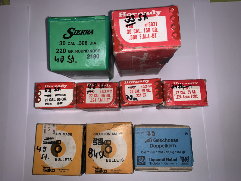 Zu verkaufen ist ein Konvolut an verschiedenen Geschossen offene Packete Mengeninhalt der Packung ist mit Edding drauf geschrieben Art der Geschosse steht auf der Verpackung siehe Foto. Versand in die EU möglich 19,90 €