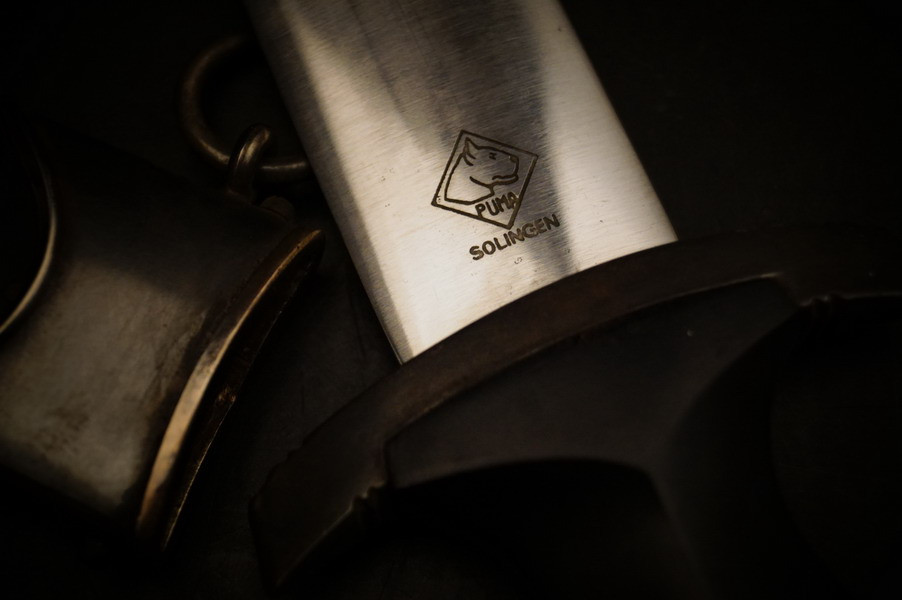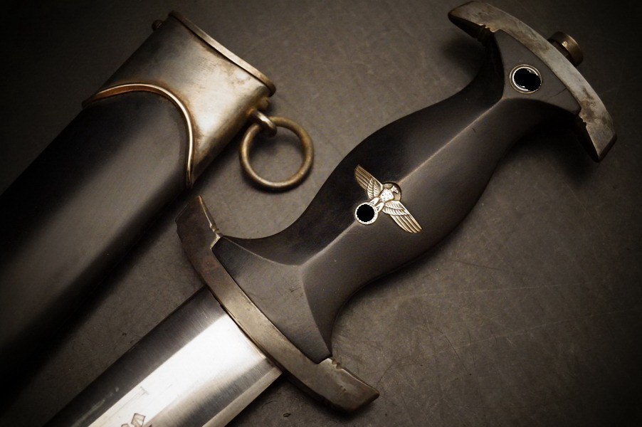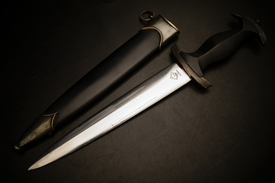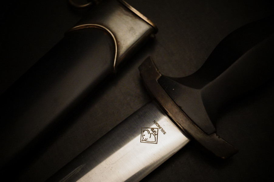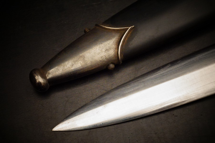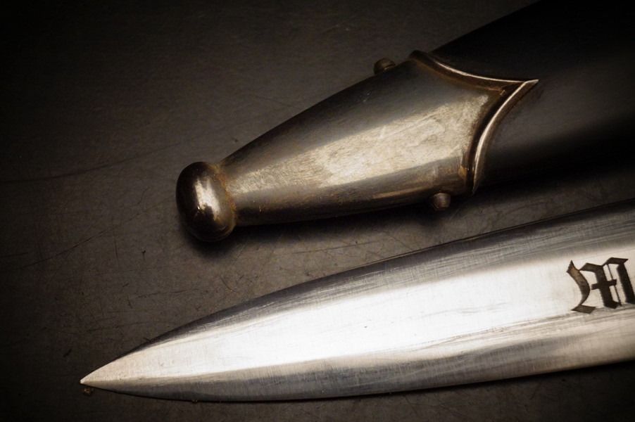 Fundzustand. Stahlscheide mit versilberten Beschlägen. Innen zwei Zungenfedern und saugender Sitz der Klinge. Klinge im Gesenk geschmiedet. Motto und Hersteller mit gleichem Ätzbild. Holzgriffstück. Parierstangen mit P und A innen und versilbert. Versilberter Adler mit Splinten innen. Keine Schäden, ungeputzt.