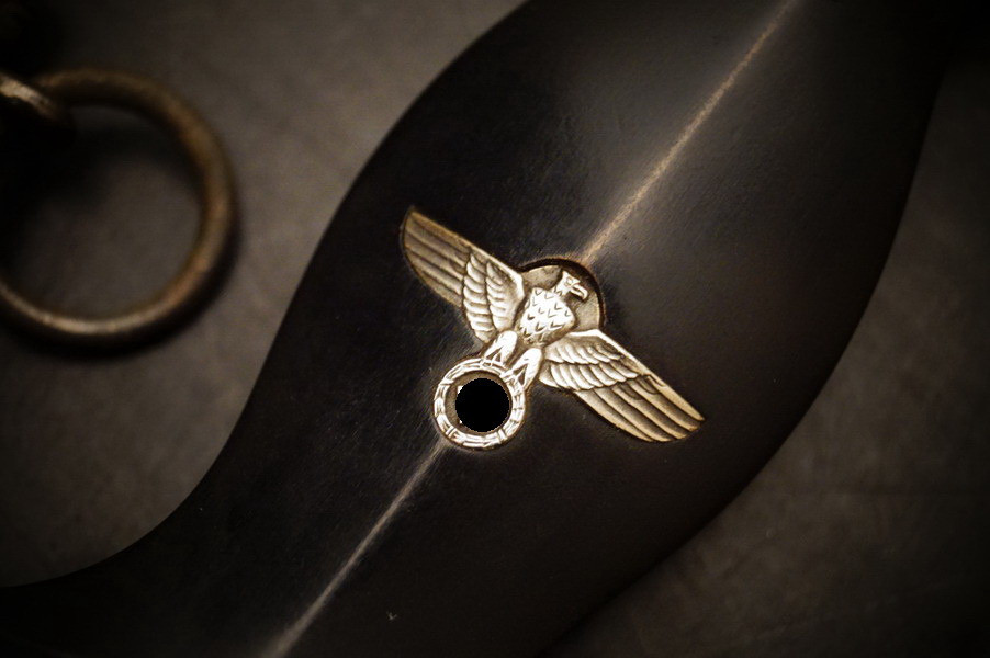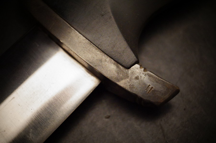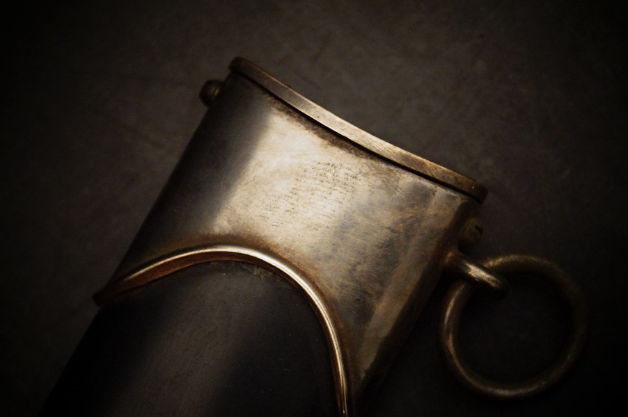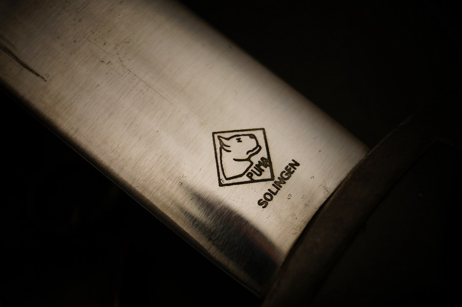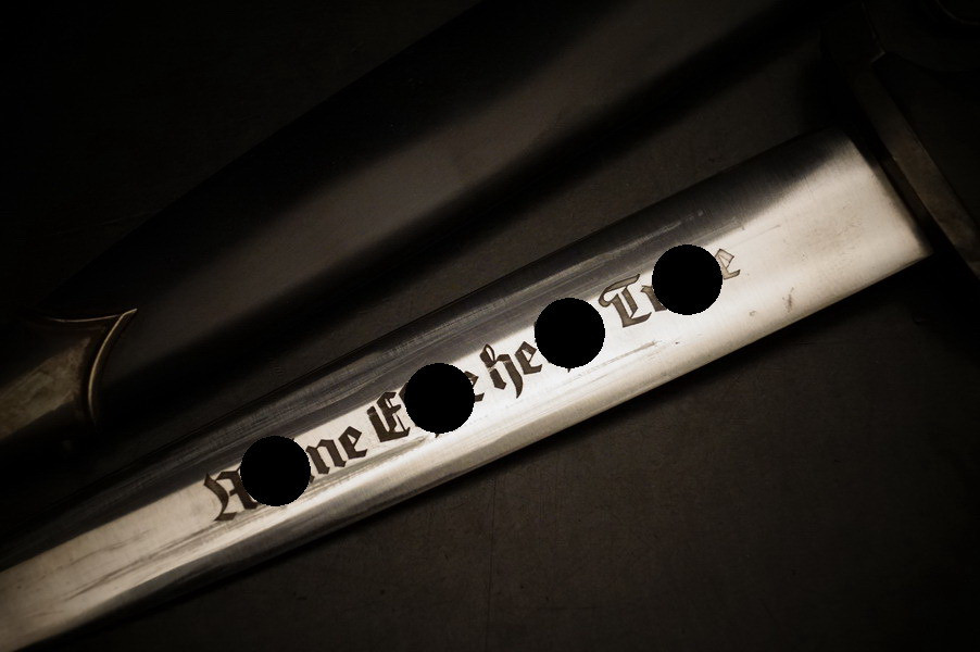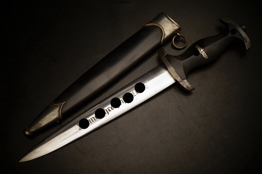 Fundzustand. Stahlscheide mit versilberten Beschlägen. Innen zwei Zungenfedern und saugender Sitz der Klinge. Klinge im Gesenk geschmiedet. Motto und Hersteller mit gleichem Ätzbild. Holzgriffstück. Parierstangen mit P und A innen und versilbert. Versilberter Adler mit Splinten innen. Keine Schäden, ungeputzt.