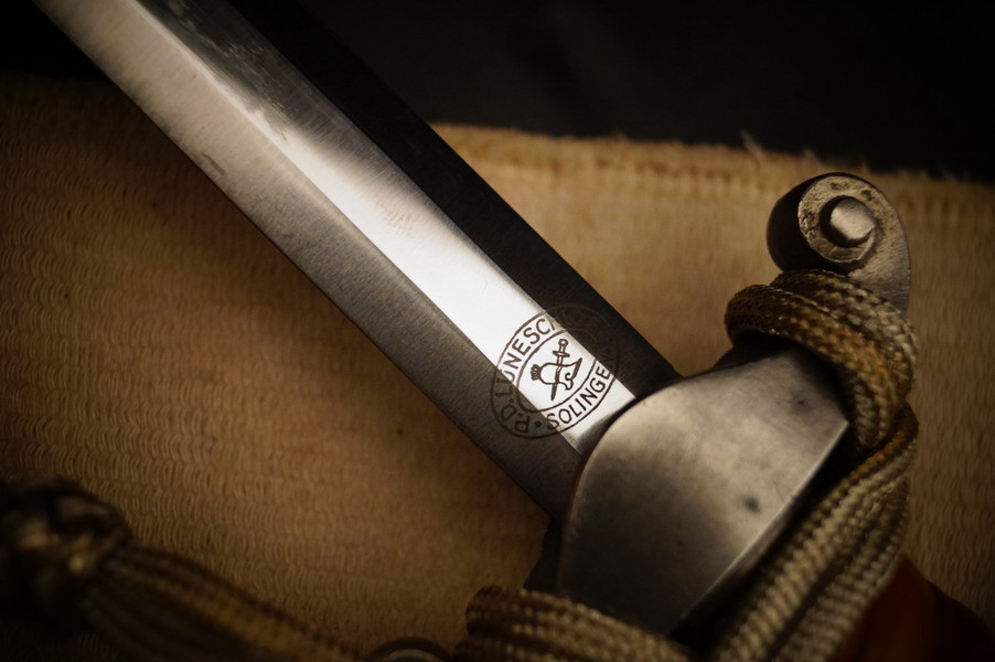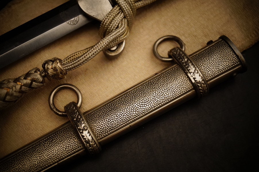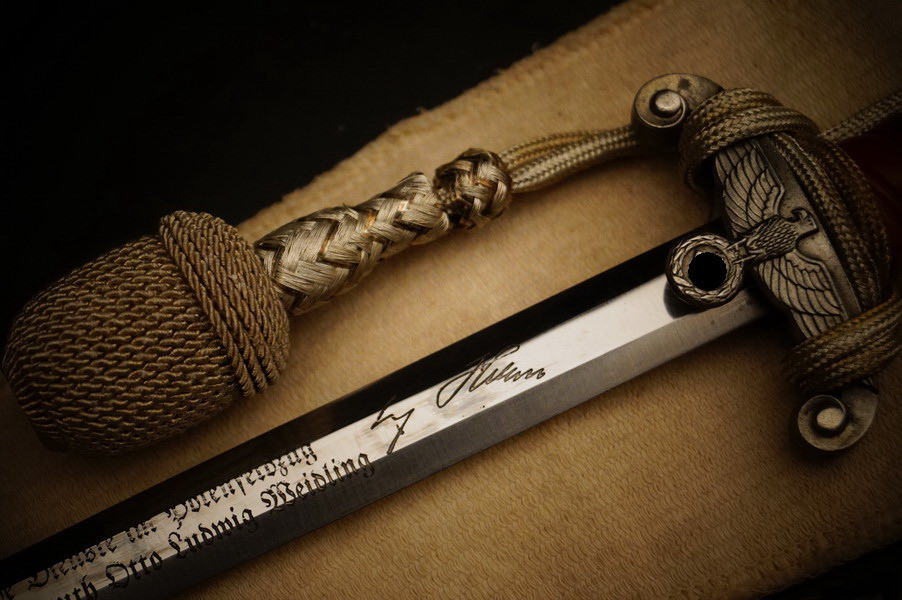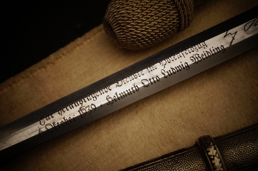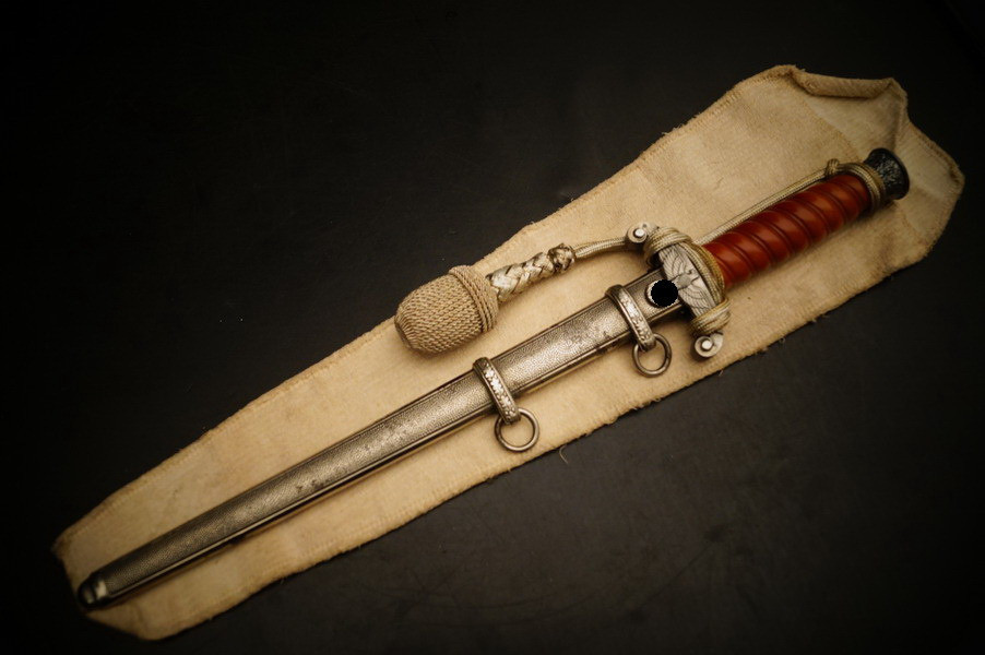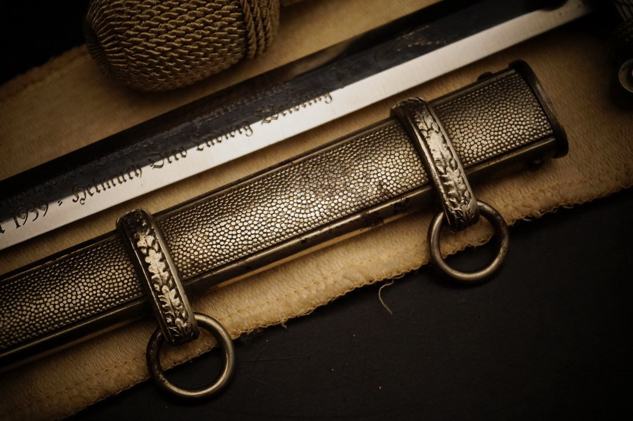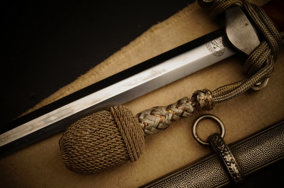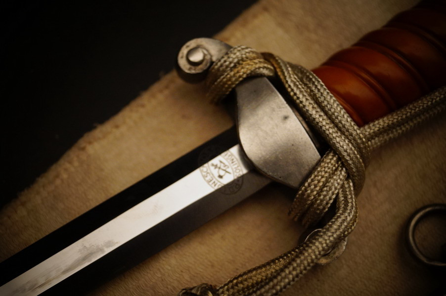 Fundzustand. Stahlscheide mit der kompletten Versilberung. Klinge geschmiedet und mit Hersteller. Sehr feine Klinge und nur minimal Altersspuren. Griffstück ist lang und ohne Risse. Portepee teile mit Alu und Silberfaden vergoldet. Mit dem Schutzfutter bzw. der Tasche. Tasche ohne UV-Leuchten.