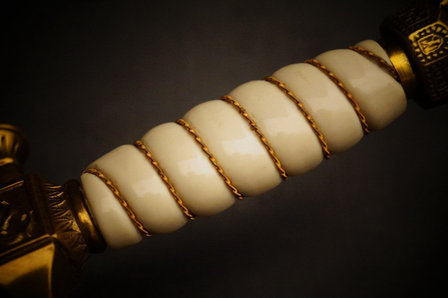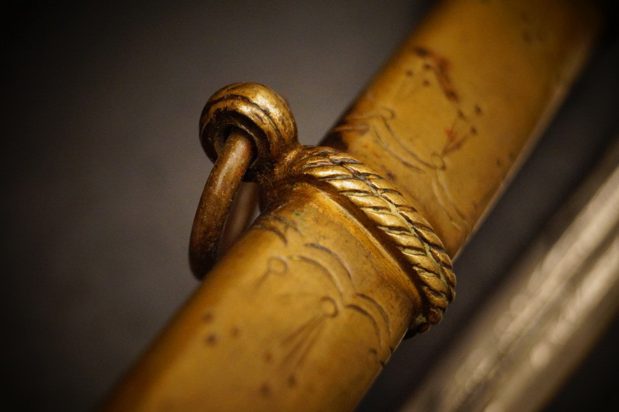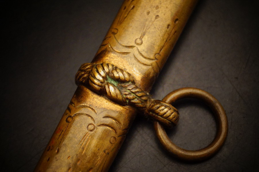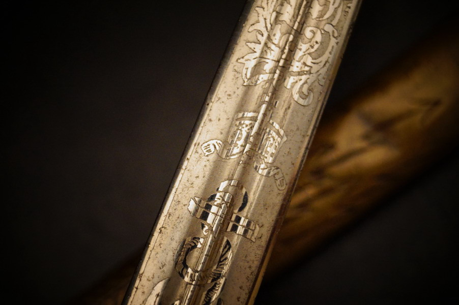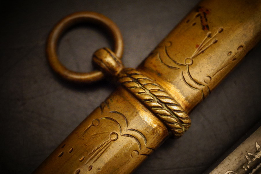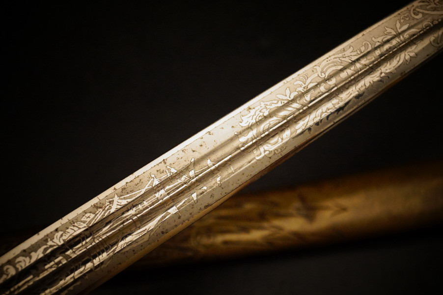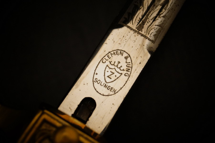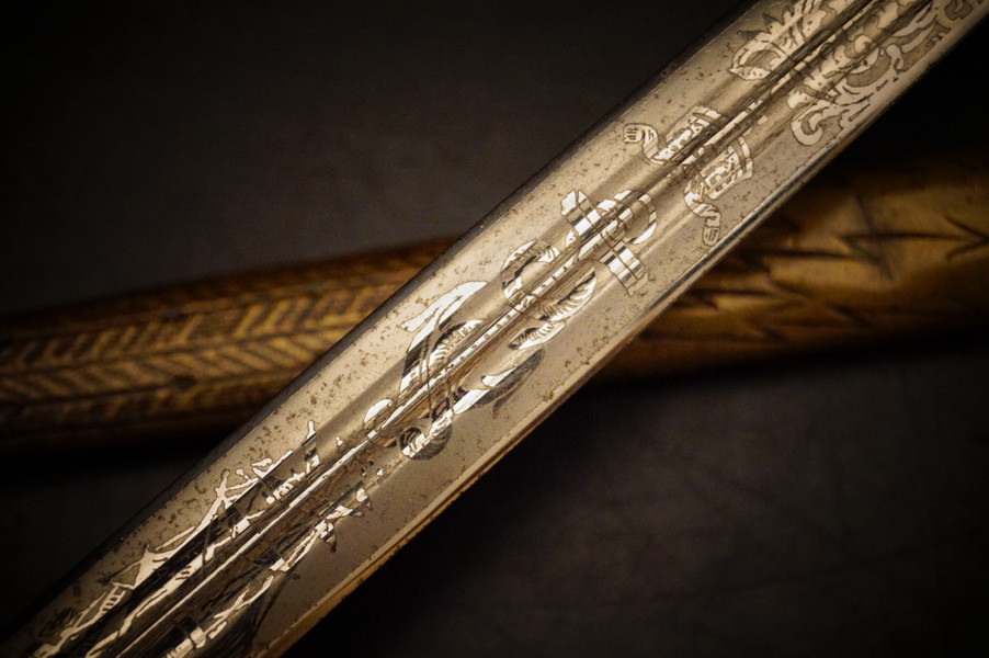 Fundzustand. Bronzescheide, vergoldet und innen mit Holzplatten. Klinge mit beidseitiger doppelter Kehlung / Blurinne. Zierätzung beidseitig. Bronzeteile bei der Parierstange und bei dem mehrteiligen Kronenknauf. Griff ohne Schäden und mit sehr feinem vergoldetem Silberdraht umwickelt.