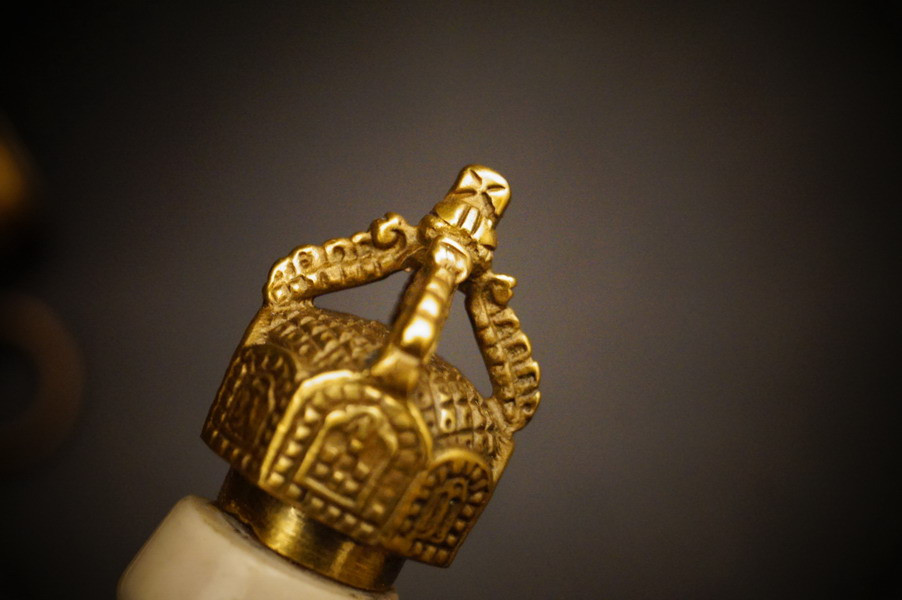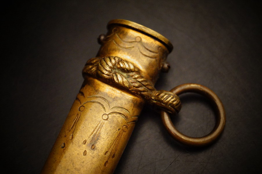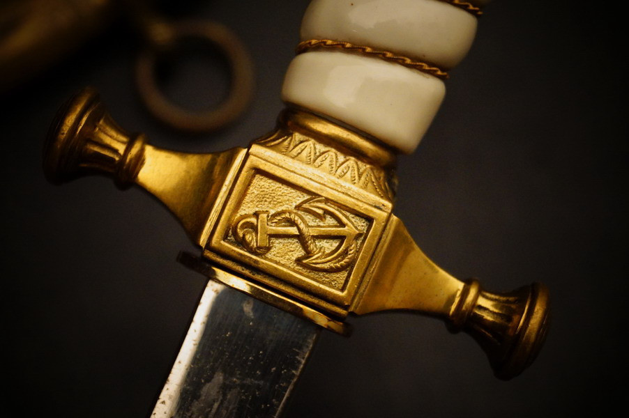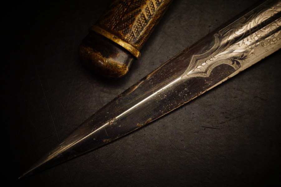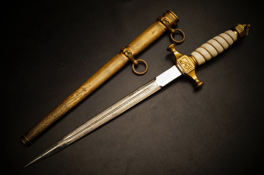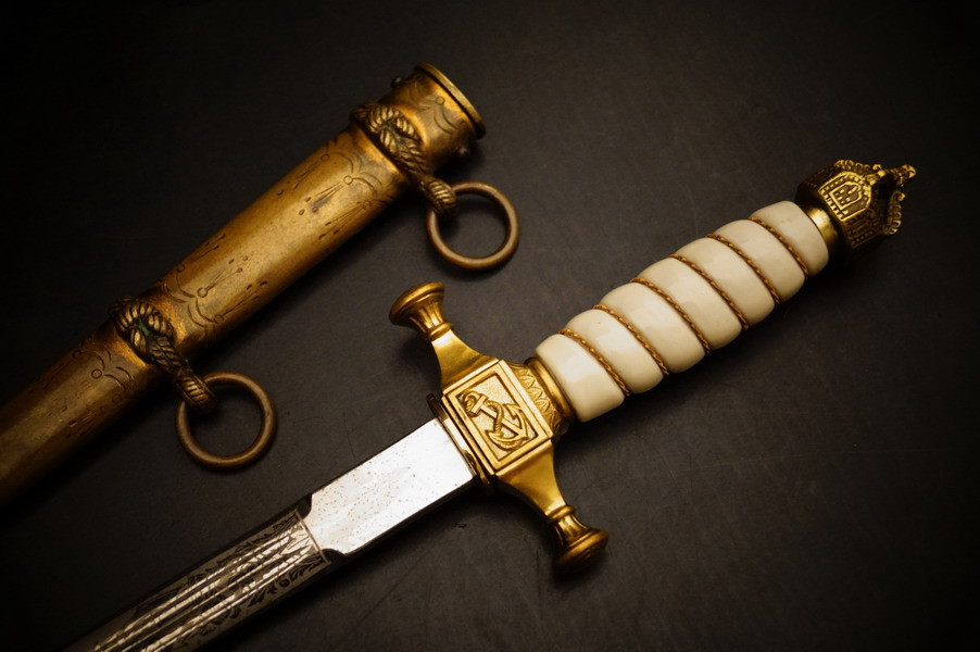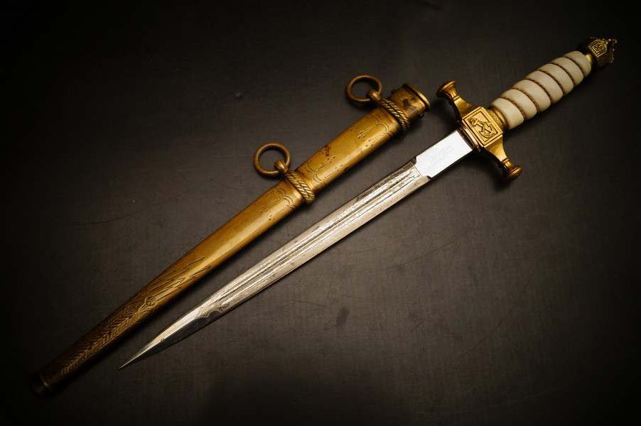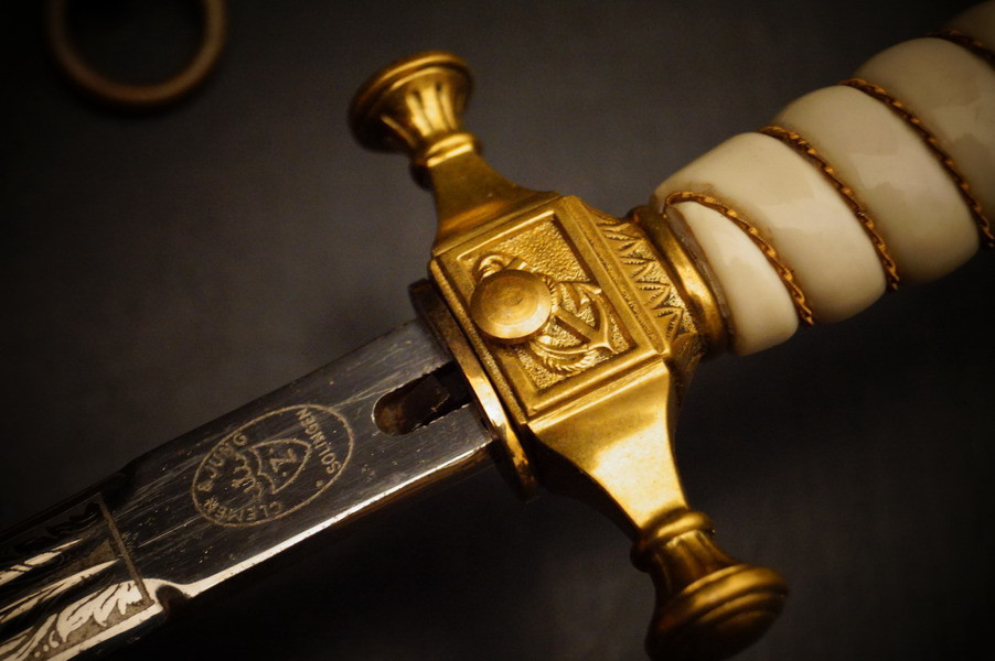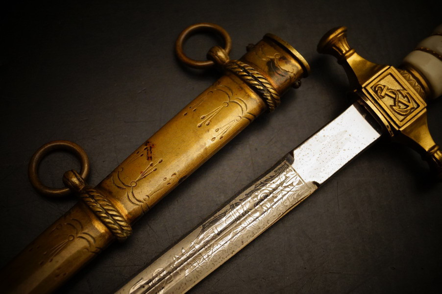 Fundzustand. Bronzescheide, vergoldet und innen mit Holzplatten. Klinge mit beidseitiger doppelter Kehlung / Blurinne. Zierätzung beidseitig. Bronzeteile bei der Parierstange und bei dem mehrteiligen Kronenknauf. Griff ohne Schäden und mit sehr feinem vergoldetem Silberdraht umwickelt.