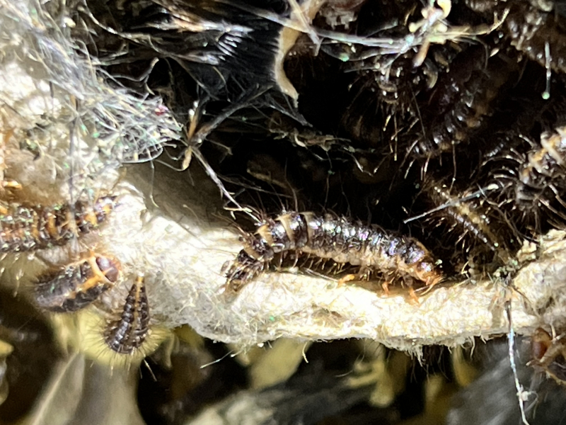 Zuchtansatz von Dornspeckkäfer (Dermestes macelatus) für Knochenpräparation. Mittels Speckkäfer lassen sich kleine Schädel sowie Skelette säubern.