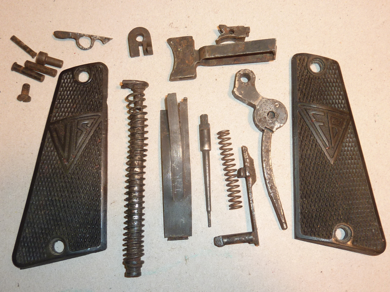 Gute Griffschalen und viele Kleinteile, siehe Foto. Die Kleinteile sind zum Teil narbig aber brauchbar, Federn in Ordnung!