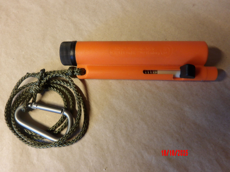 Der Signalstift wird schon lange nicht mehr gebaut und bekommt auch in diesem Kal. keine Zulassung mehr. Die wiederladbaren Alu-Hülsen sind mit einer 6mm Flobert Randzünder Platzpatrone (RWS) und einer roten Leuchtkugel im Kal. 15mm bestückt (Herstellungsdatum unbekannt).