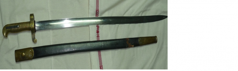 Säbelbajonett, gekauft bei HH, Auktionsnummer 43, 10/2002 als Bajonett Sharps, wegen fehlendem Hersteller und Inspektoren stempel ist dies nicht korrekt, kann eine Kopie nicht ausschliessen, Scheide leicht beschädigt.