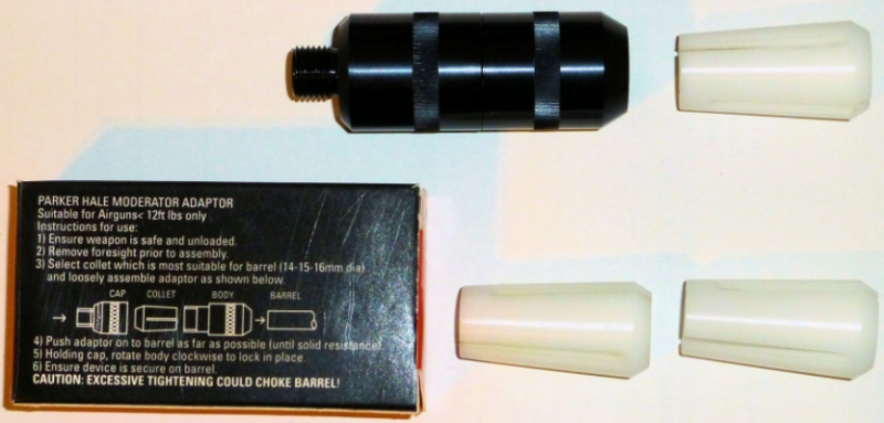 Verkaufe Parker Hale Universal-Schalldämpfer-Adapter, der ohne Veränderung des Originallaufs auf diesen aufgesteckt und festgezogen werden kann. Dadurch geeignet z.B. für Luftgewehr oder KK-Gewehr. Das Gewinde des Adapters zum Aufschrauben eines Schalldämpfers beträgt 1/2"x20 UNF, also dem Standardgewinde von F-Luftgewehr-Schalldämpfern.