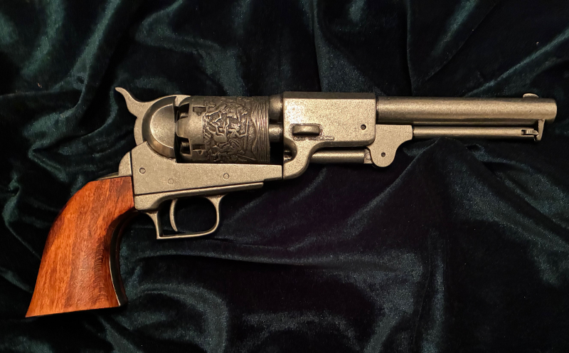 Detailgetreue Nachbildung eines Colt Dragoon Army Revolver. Rahmen, Trommel und Lauf bestehen aus einer Zink-Aluminium Legierung und sind silber, die Trommel ist mit Gravuren versehen.