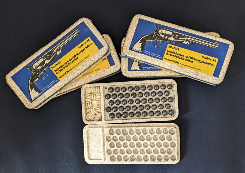 5 volle Schachteln mit je 50 Schwarzpulverpresslingen im Kaliber .44 plus Dichtungsscheiben = 125 Presslinge!!!