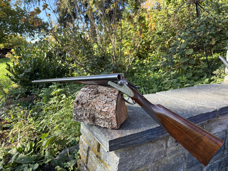 Verkaufe im Auftrag: Merkel Seitenschloss Doppelflinte, vermutlich Modell 60E, Lauflänge 71cm, Schaftlänge (vom vorderen Anzug gemssen) 37cm, Gesamtlänge 114cm. Sehr schöne englische Schäftung, kleine Macken am Hinterschaft. Zustand siehe Bilder! Mit dabei ist ein Gewehrriemen, 2 Pufferpatronen und eine Anleitung von Merkel. EWB erforderlich!