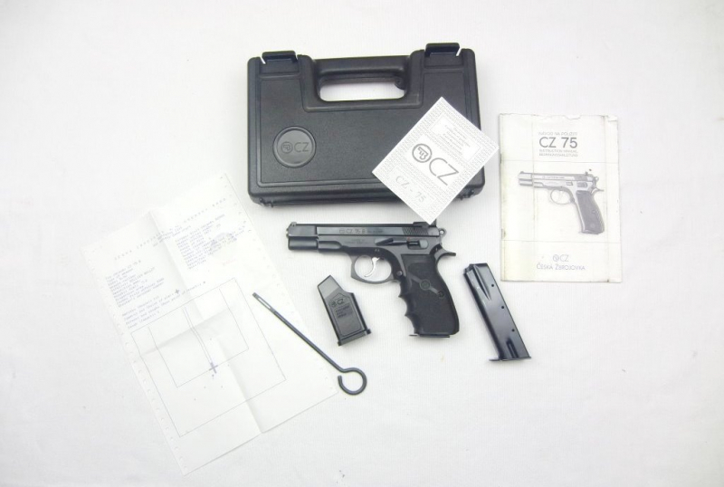 Sie bieten auf eine Sportpistole CZ 75B im Kaliber 9mm Luger. 4,5“ Lauflänge mit verstellbarer Visierung (Lauf von innen ohne Mängel), seitliche Schiebesicherung, außenliegender Hahn, Double Action Funktion, Abzug mit Triggerstop, 16-Schuß Magazin inklusive Reservemagazin, Ladehilofe, seitlicher Magazinhalteknopf, schwarze Hogue Gummi-Griffschalen mit Fingerrillen für Rechts-und Linksschützen. Sehr guter Zustand!!!