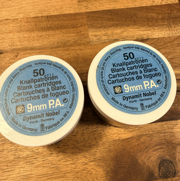 ich biete zwei Dosen Knallpatronen der Firma Dynamit Nobel. Eine Dose ist angebrochen, enthält 46 Patronen von 50. Zweite Dose komplett. Gesamt also 96 Knallpatronen, losgleich.
