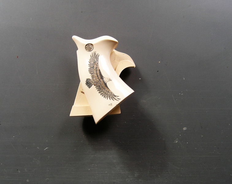 Griffschalen für einen S&W M 29(oder N-Rahmen) Square Butt - also der eckige Rahmentyp. Material Kunstelfenbein ("Ivorite") mit Scrimshaw-Gravur Seeadler und Künstler-Signé.