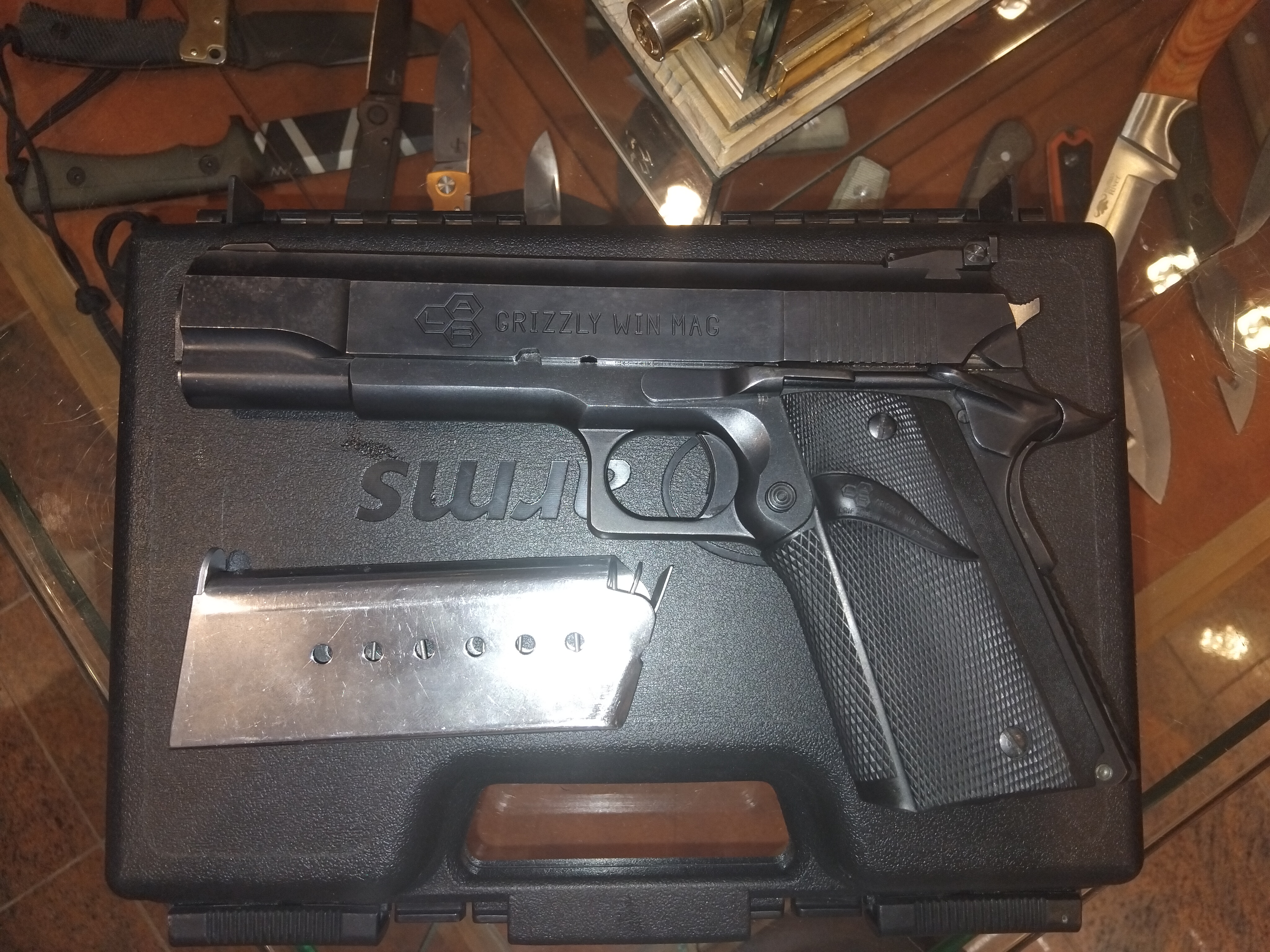 Zum Verkauf steht eine halbautomatische Pistole L.A.R. Grizzly MARK I der Firma LAR Manufacturing aus Utah, im Kaliber .45 Winchester Magnum. Die Waffe verfügt über gültigen Nitrobeschuss und kommt mit einem 7-Schuss-Magazin. Ausgestattet mit einem LPA-Mikrometervisier. Der Lauf ist 5,4 Zoll lang. Das ist die handlichere Version, bei der der Lauf nicht übersteht, sondern bündig mit dem Schlitten abschließt. Die Waffe befindet sich in normalem gebrauchten Zustand, siehe Fotos.