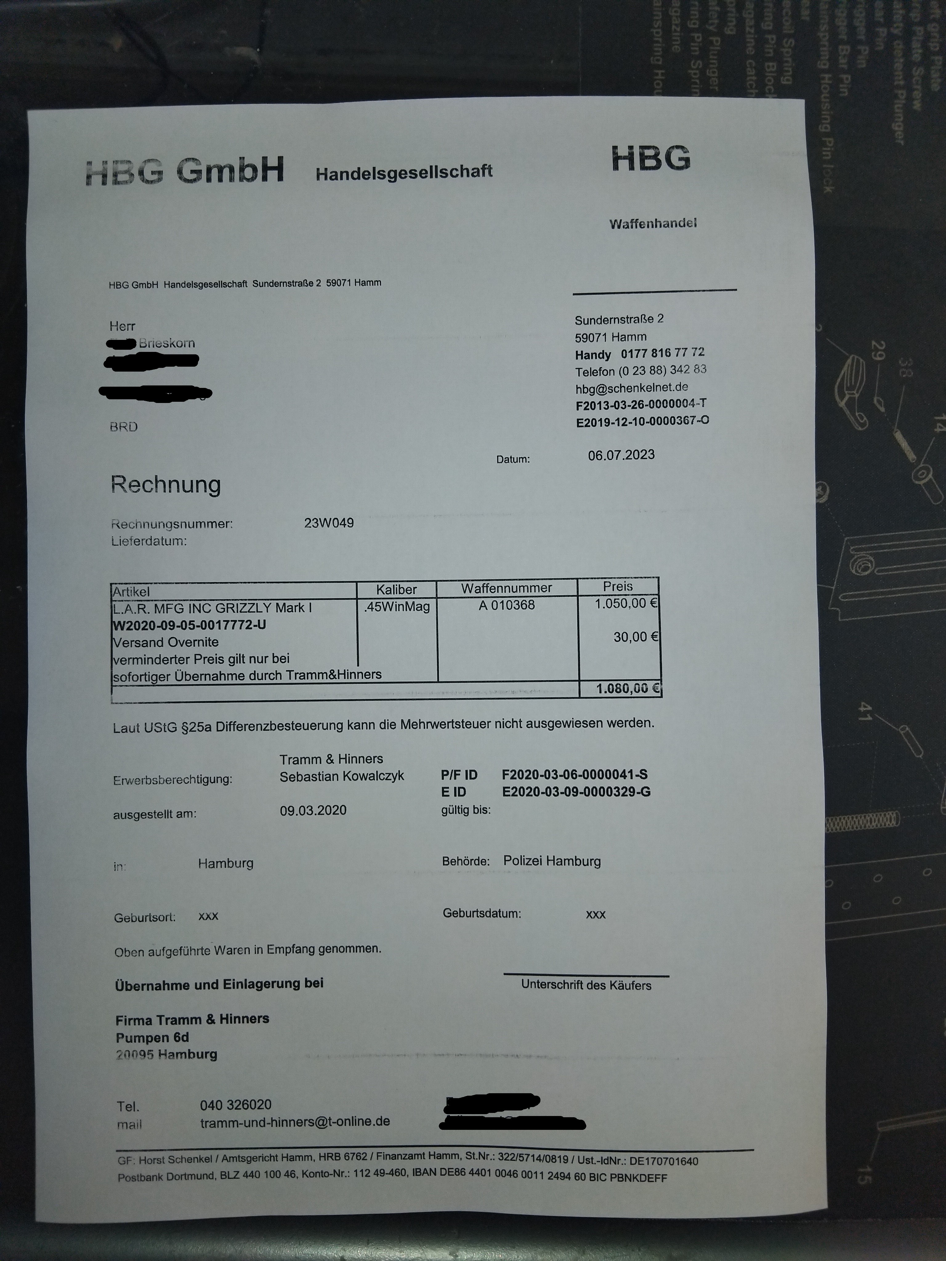 Der Vorbesitzer (Händler, Herr Horst Schenkel, HBG GmbH, siehe Rechnung) hat die Pistole getestet und mir die einwandfreie Funktionalität der Waffe versichert. Wir selbst haben die Pistole nie geschossen, sie war die ganze Zeit bei Tramm und Hinners in Hamburg eingelagert und kann dort auch besichtigt werden.