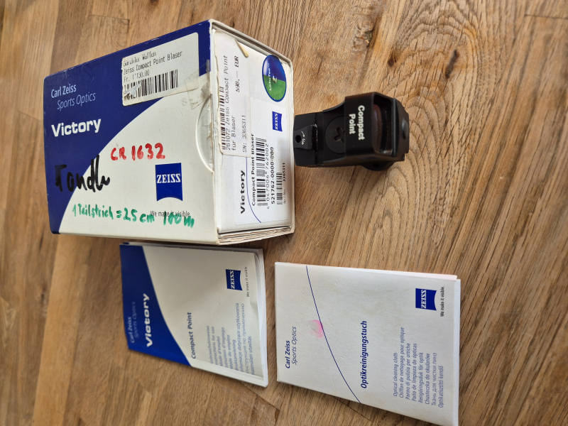 Hallo, ich verkaufe hier ein neuwertiges Zeiss Compact-Rotpunkt mit Blaser-Montage, welches super z.B. für IPSC Drückjagd usw. geeignet ist. Es war nur selten im Einsatz und hat nur wenige Gebrauchsspuren z.B. am Batteriedeckel (bitte siehe Bilder) nun bin ich am Schränke aufräumen und will mich von diversen Sportgeräten trennen und somit ist das dazugedachte Equipment nun auch übrig. Es für die Montage mit Blaser-Aufnahme gedacht. Bitte schauen Sie sich auch meine diversen anderen Auktionen an, da gibts noch diverse andere Schnäpchen. So jetzt das Übliche: dies ist ein Privatverkauf, deshalb keine Garantie, keine Gewährleistung, keine Rücknahme, keine Rückerstattung, gekauft wie gesehen ... usw.