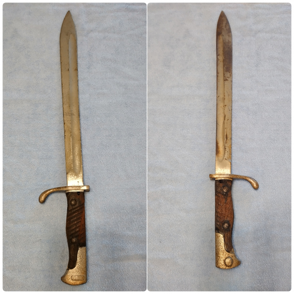 Hier kommt ein gebrauchtes Bajonett zur Versteigerung. Wenn ich richtig liege, handelt es sich hier um ein 98/05. Leider sind keine Stempelungen durch mich zu erkennen. Den Zustand sehr ihr auf den Bildern, die Klinge und Griffstücke (Holz) weisen zum Teil starke Gebrauchsspuren auf. Der Druckknopf ist fest. Das Bajonett stammt aus einem Nachlass, den ich übernommen habe, aber Bajonette gehören nicht zu meinem Sammelgebiet. Versand nur gegen Altersnachweis (+18), der Käufer bzw die Käuferin sollte fähig sein, mir eine Kopie des Personalausweis digital zukommen zu lassen, an diese Adresse geht das versicherte DHL Paket dann auch. Das ist ein Privatverkauf - daher keine Garantie, Gewährleistung, Umtausch, Rücknahme oder Wandlung. Versand nur Deutschland ohne Inseln. Leider ist der Hersteller und die weitere Prägung zumindest von mir nicht zu entziffern. Ihr bekommt genau dieses Bajonett ohne Scheide. Ideales Stück / Basis zum Restaurieren oder Konservieren.