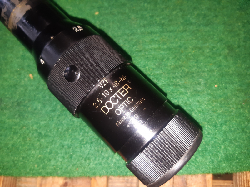 Docter 2.5-10x48. Absehen 1. Deutliche Montagespuren der Ringmontage. Vergrößerung und Okularverstellung laufen leichtgängig. Mehrere Kratzer in der Oberflächenbeschichtung. Vergütung nicht verschrammt. Am Objektiv sind ganz aussen zwei Stellen zu sehen die wie feine Risse aussehen. Bild zeigt es ziemlich gut, andere Stelle ist vergleichbar. Objektivgehäuse aber ohne Macken. Habe das Glas in diesem Zustand gekauft und ohne Probleme auf einer .222 geführt. Kein eyecatcher aber funktional. Bei Fragen gerne melden.